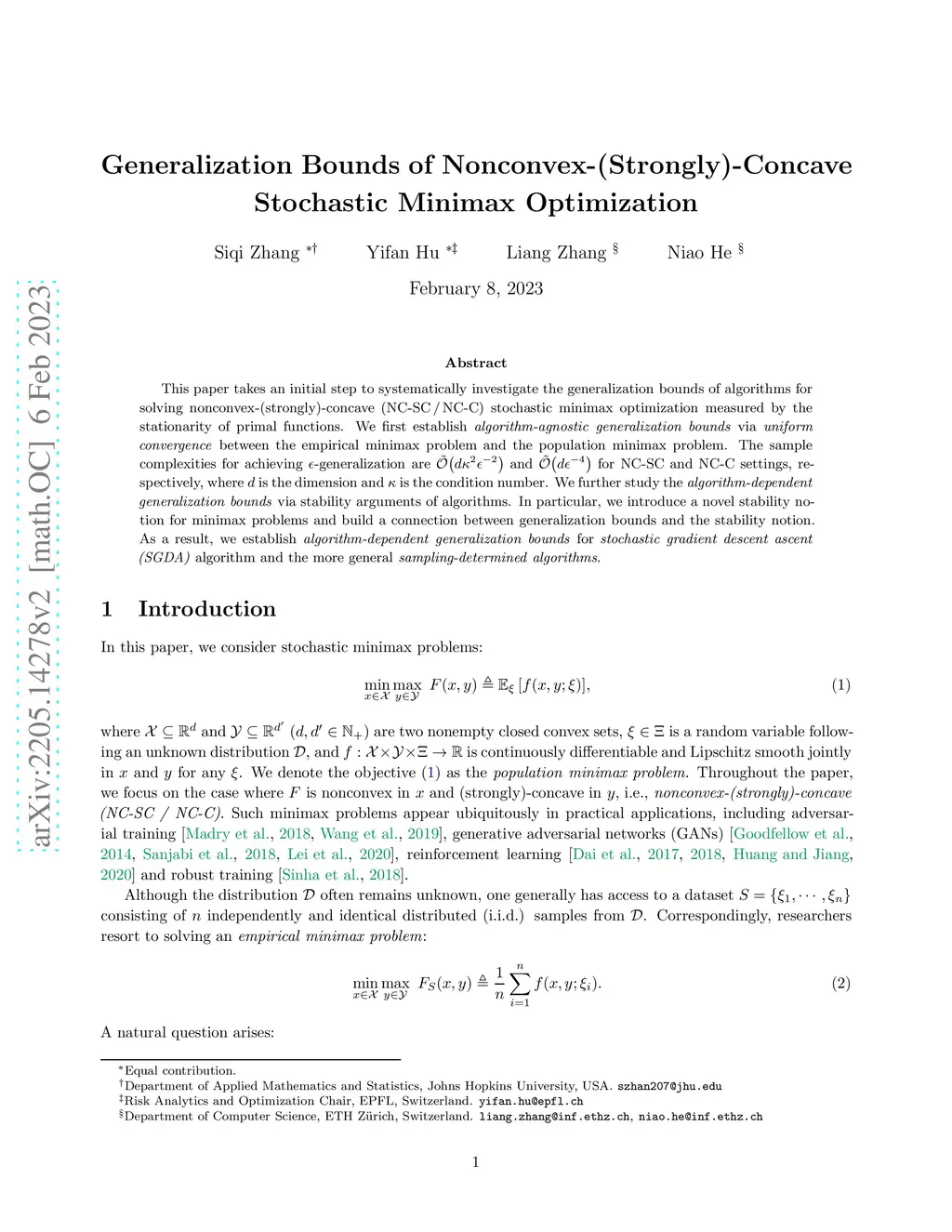This paper takes an initial step to systematically investigate the generalization bounds of algorithms for solving nonconvex-(strongly)-concave (NC-SC/NC-C) stochastic minimax optimization measured by the stationarity of primal functions. We first establish algorithm-agnostic generalization bounds via uniform convergence between the empirical minimax problem and the population minimax problem. The sample complexities for achieving -generalization are and for NC-SC and NC-C settings, respectively, where is the dimension and is the condition number. We further study the algorithm-dependent generalization bounds via stability arguments of algorithms. In particular, we introduce a novel stability notion for minimax problems and build a connection between generalization bounds and the stability notion. As a result, we establish algorithm-dependent generalization bounds for stochastic gradient descent ascent (SGDA) algorithm and the more general sampling-determined algorithms.