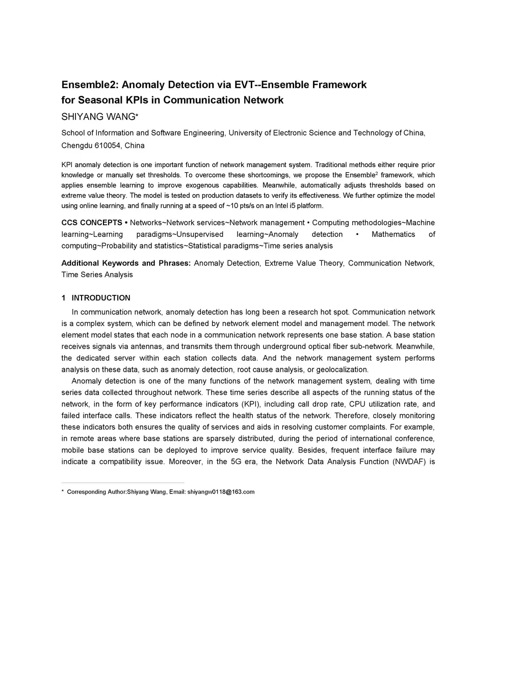 KPI anomaly detection is one important function of network management system. Traditional methods either require prior knowledge or manually set thresholds. To overcome these shortcomings, we propose the Ensemble2 framework, which applies ensemble learning to improve exogenous capabilities. Meanwhile, automatically adjusts thresholds based on extreme value theory. The model is tested on production datasets to verify its effectiveness. We further optimize the model using online learning, and finally running at a speed of ~10 pts/s on an Intel i5 platform.