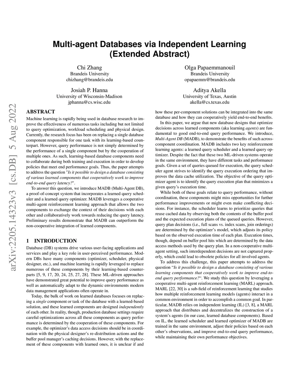 Machine learning is rapidly being used in database research to improve the effectiveness of numerous tasks included but not limited to query optimization, workload scheduling, physical design, etc. Currently, the research focus has been on replacing a single database component responsible for one task by its learning-based counterpart. However, query performance is not simply determined by the performance of a single component, but by the cooperation of multiple ones. As such, learning based database components need to collaborate during both training and execution in order to develop policies that meet end performance goals. Thus, the paper attempts to address the question "Is it possible to design a database consisting of various learned components that cooperatively work to improve end-to-end query latency?". To answer this question, we introduce MADB (Multi-Agent DB), a proof-of-concept system that incorporates a learned query scheduler and a learned query optimizer. MADB leverages a cooperative multi-agent reinforcement learning approach that allows the two components to exchange the context of their decisions with each other and collaboratively work towards reducing the query latency. Preliminary results demonstrate that MADB can outperform the non-cooperative integration of learned components.