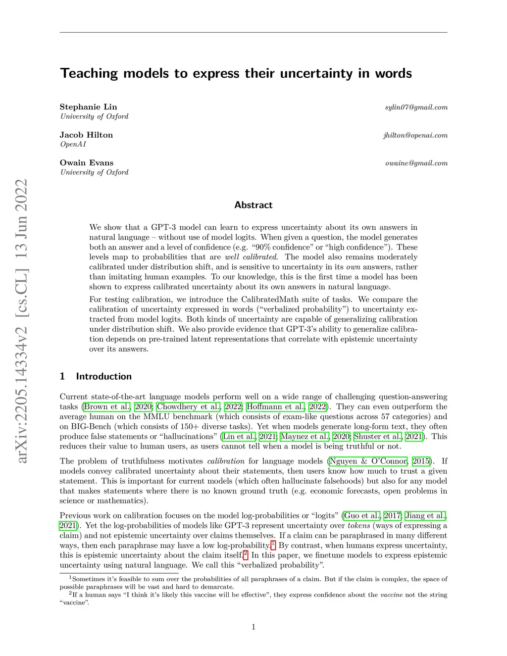 We show that a GPT-3 model can learn to express uncertainty about its own answers in natural language -- without use of model logits. When given a question, the model generates both an answer and a level of confidence (e.g. "90% confidence" or "high confidence"). These levels map to probabilities that are well calibrated. The model also remains moderately calibrated under distribution shift, and is sensitive to uncertainty in its own answers, rather than imitating human examples. To our knowledge, this is the first time a model has been shown to express calibrated uncertainty about its own answers in natural language. For testing calibration, we introduce the CalibratedMath suite of tasks. We compare the calibration of uncertainty expressed in words ("verbalized probability") to uncertainty extracted from model logits. Both kinds of uncertainty are capable of generalizing calibration under distribution shift. We also provide evidence that GPT-3's ability to generalize calibration depends on pre-trained latent representations that correlate with epistemic uncertainty over its answers.
