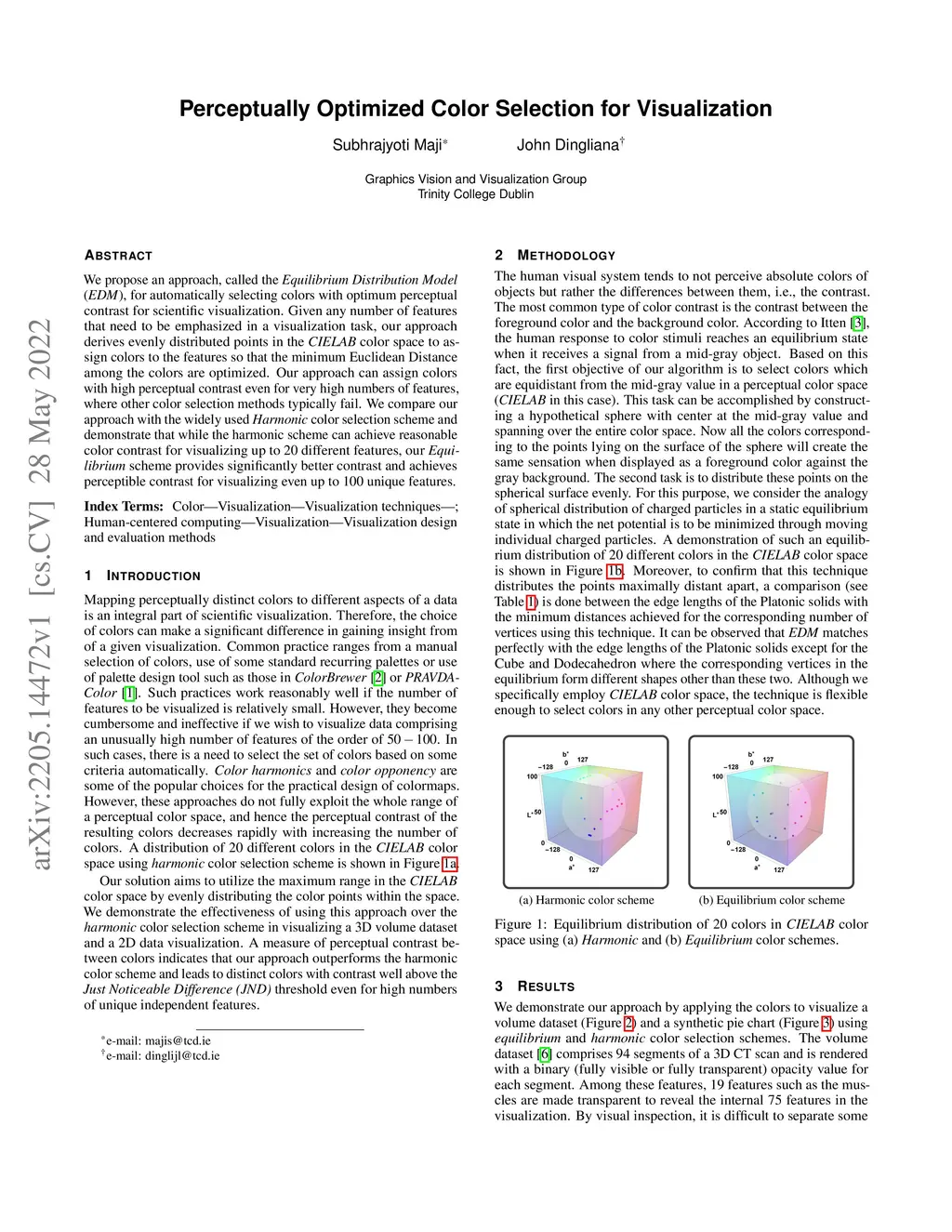 We propose an approach, called the Equilibrium Distribution Model (EDM), for automatically selecting colors with optimum perceptual contrast for scientific visualization. Given any number of features that need to be emphasized in a visualization task, our approach derives evenly distributed points in the CIELAB color space to assign colors to the features so that the minimum Euclidean Distance among the colors are optimized. Our approach can assign colors with high perceptual contrast even for very high numbers of features, where other color selection methods typically fail. We compare our approach with the widely used Harmonic color selection scheme and demonstrate that while the harmonic scheme can achieve reasonable color contrast for visualizing up to 20 different features, our Equilibrium scheme provides significantly better contrast and achieves perceptible contrast for visualizing even up to 100 unique features.