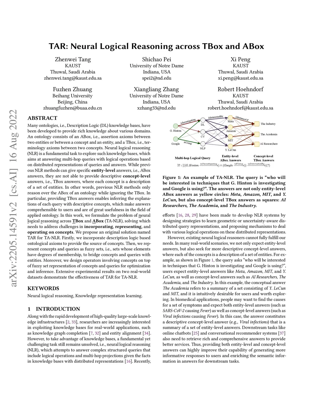 Many ontologies, i.e., Description Logic (DL) knowledge bases, have been developed to provide rich knowledge about various domains. An ontology consists of an ABox, i.e., assertion axioms between two entities or between a concept and an entity, and a TBox, i.e., terminology axioms between two concepts. Neural logical reasoning (NLR) is a fundamental task to explore such knowledge bases, which aims at answering multi-hop queries with logical operations based on distributed representations of queries and answers. While previous NLR methods can give specific entity-level answers, i.e., ABox answers, they are not able to provide descriptive concept-level answers, i.e., TBox answers, where each concept is a description of a set of entities. In other words, previous NLR methods only reason over the ABox of an ontology while ignoring the TBox. In particular, providing TBox answers enables inferring the explanations of each query with descriptive concepts, which make answers comprehensible to users and are of great usefulness in the field of applied ontology. In this work, we formulate the problem of neural logical reasoning across TBox and ABox (TA-NLR), solving which needs to address challenges in incorporating, representing, and operating on concepts. We propose an original solution named TAR for TA-NLR. Firstly, we incorporate description logic based ontological axioms to provide the source of concepts. Then, we represent concepts and queries as fuzzy sets, i.e., sets whose elements have degrees of membership, to bridge concepts and queries with entities. Moreover, we design operators involving concepts on top of fuzzy set representation of concepts and queries for optimization and inference. Extensive experimental results on two real-world datasets demonstrate the effectiveness of TAR for TA-NLR.