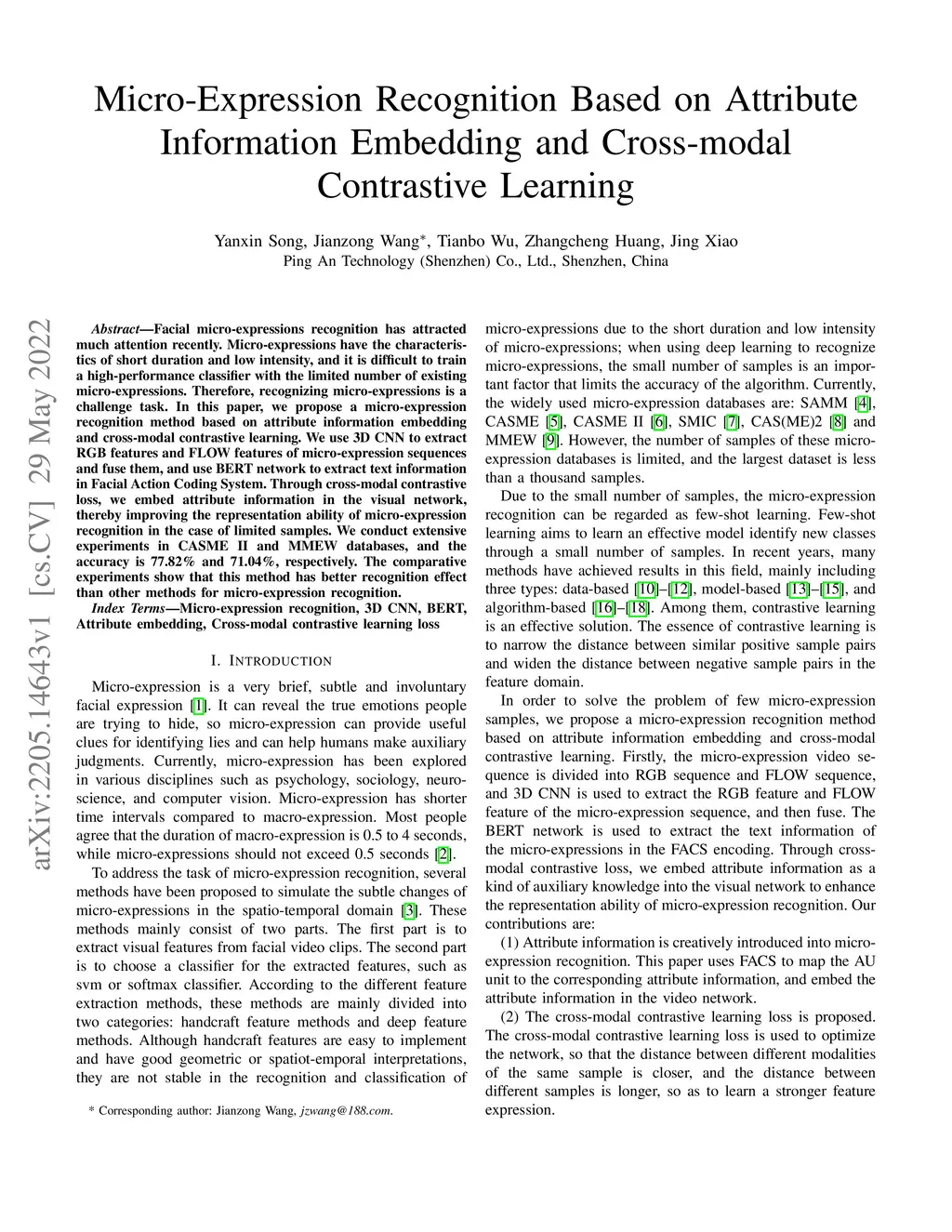 Facial micro-expressions recognition has attracted much attention recently. Micro-expressions have the characteristics of short duration and low intensity, and it is difficult to train a high-performance classifier with the limited number of existing micro-expressions. Therefore, recognizing micro-expressions is a challenge task. In this paper, we propose a micro-expression recognition method based on attribute information embedding and cross-modal contrastive learning. We use 3D CNN to extract RGB features and FLOW features of micro-expression sequences and fuse them, and use BERT network to extract text information in Facial Action Coding System. Through cross-modal contrastive loss, we embed attribute information in the visual network, thereby improving the representation ability of micro-expression recognition in the case of limited samples. We conduct extensive experiments in CASME II and MMEW databases, and the accuracy is 77.82% and 71.04%, respectively. The comparative experiments show that this method has better recognition effect than other methods for micro-expression recognition.