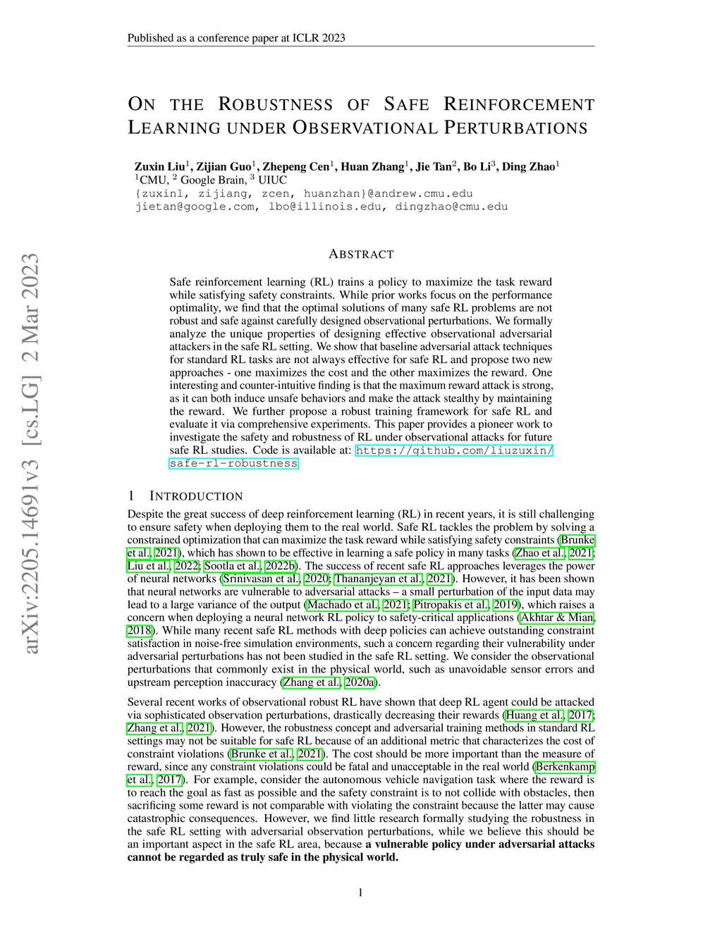 Safe reinforcement learning (RL) trains a policy to maximize the task reward while satisfying safety constraints. While prior works focus on the performance optimality, we find that the optimal solutions of many safe RL problems are not robust and safe against carefully designed observational perturbations. We formally analyze the unique properties of designing effective observational adversarial attackers in the safe RL setting. We show that baseline adversarial attack techniques for standard RL tasks are not always effective for safe RL and propose two new approaches - one maximizes the cost and the other maximizes the reward. One interesting and counter-intuitive finding is that the maximum reward attack is strong, as it can both induce unsafe behaviors and make the attack stealthy by maintaining the reward. We further propose a robust training framework for safe RL and evaluate it via comprehensive experiments. This paper provides a pioneer work to investigate the safety and robustness of RL under observational attacks for future safe RL studies. Code is available at: \url{https://github.com/liuzuxin/safe-rl-robustness}