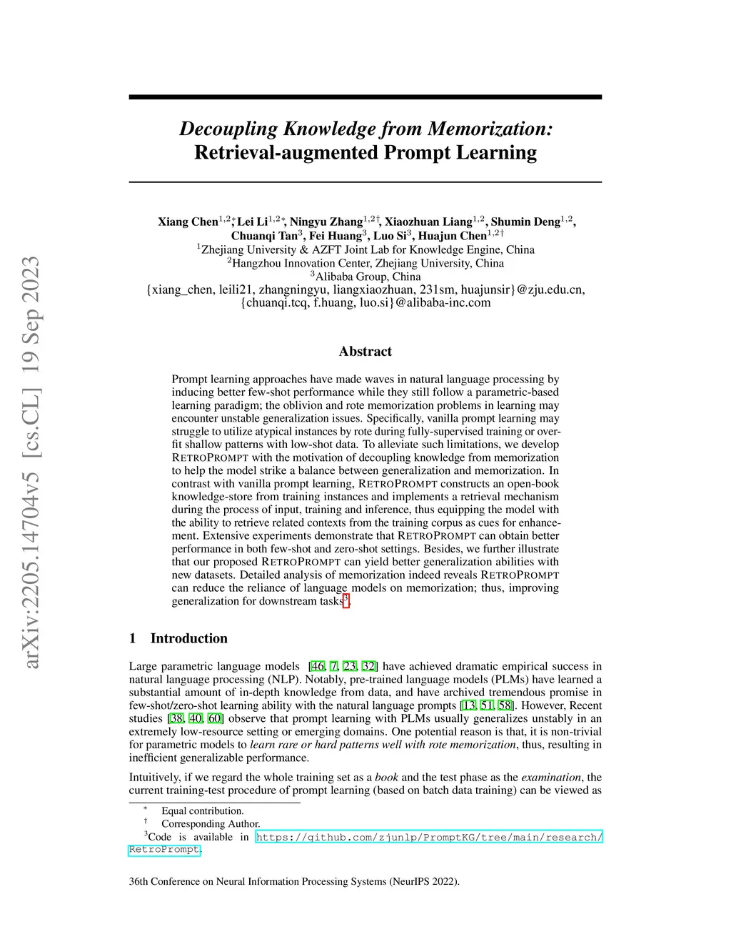 Prompt learning approaches have made waves in natural language processing by inducing better few-shot performance while they still follow a parametric-based learning paradigm; the oblivion and rote memorization problems in learning may encounter unstable generalization issues. Specifically, vanilla prompt learning may struggle to utilize atypical instances by rote during fully-supervised training or overfit shallow patterns with low-shot data. To alleviate such limitations, we develop RetroPrompt with the motivation of decoupling knowledge from memorization to help the model strike a balance between generalization and memorization. In contrast with vanilla prompt learning, RetroPrompt constructs an open-book knowledge-store from training instances and implements a retrieval mechanism during the process of input, training and inference, thus equipping the model with the ability to retrieve related contexts from the training corpus as cues for enhancement. Extensive experiments demonstrate that RetroPrompt can obtain better performance in both few-shot and zero-shot settings. Besides, we further illustrate that our proposed RetroPrompt can yield better generalization abilities with new datasets. Detailed analysis of memorization indeed reveals RetroPrompt can reduce the reliance of language models on memorization; thus, improving generalization for downstream tasks. Code is available in https://github.com/zjunlp/PromptKG/tree/main/research/RetroPrompt.
