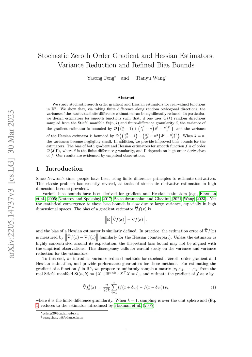 We study stochastic zeroth order gradient and Hessian estimators for real-valued functions in Rn\mathbb{R}^n. We show that, via taking finite difference along random orthogonal directions, the variance of the stochastic finite difference estimators can be significantly reduced. In particular, we design estimators for smooth functions such that, if one uses $ \Theta \left( k \right) $ random directions sampled from the Stiefel's manifold $ \text{St} (n,k) $ and finite-difference granularity δ\delta, the variance of the gradient estimator is bounded by $ \mathcal{O} \left( \left( \frac{n}{k} - 1 \right) + \left( \frac{n^2}{k} - n \right) \delta^2 + \frac{ n^2 \delta^4 }{ k } \right) $, and the variance of the Hessian estimator is bounded by $\mathcal{O} \left( \left( \frac{n^2}{k^2} - 1 \right) + \left( \frac{n^4}{k^2} - n^2 \right) \delta^2 + \frac{n^4 \delta^4 }{k^2} \right) $. When k=nk = n, the variances become negligibly small. In addition, we provide improved bias bounds for the estimators. The bias of both gradient and Hessian estimators for smooth function ff is of order O(δ2Γ)\mathcal{O} \left( \delta^2 \Gamma \right), where δ\delta is the finite-difference granularity, and $ \Gamma $ depends on high order derivatives of ff. Our results are evidenced by empirical observations.