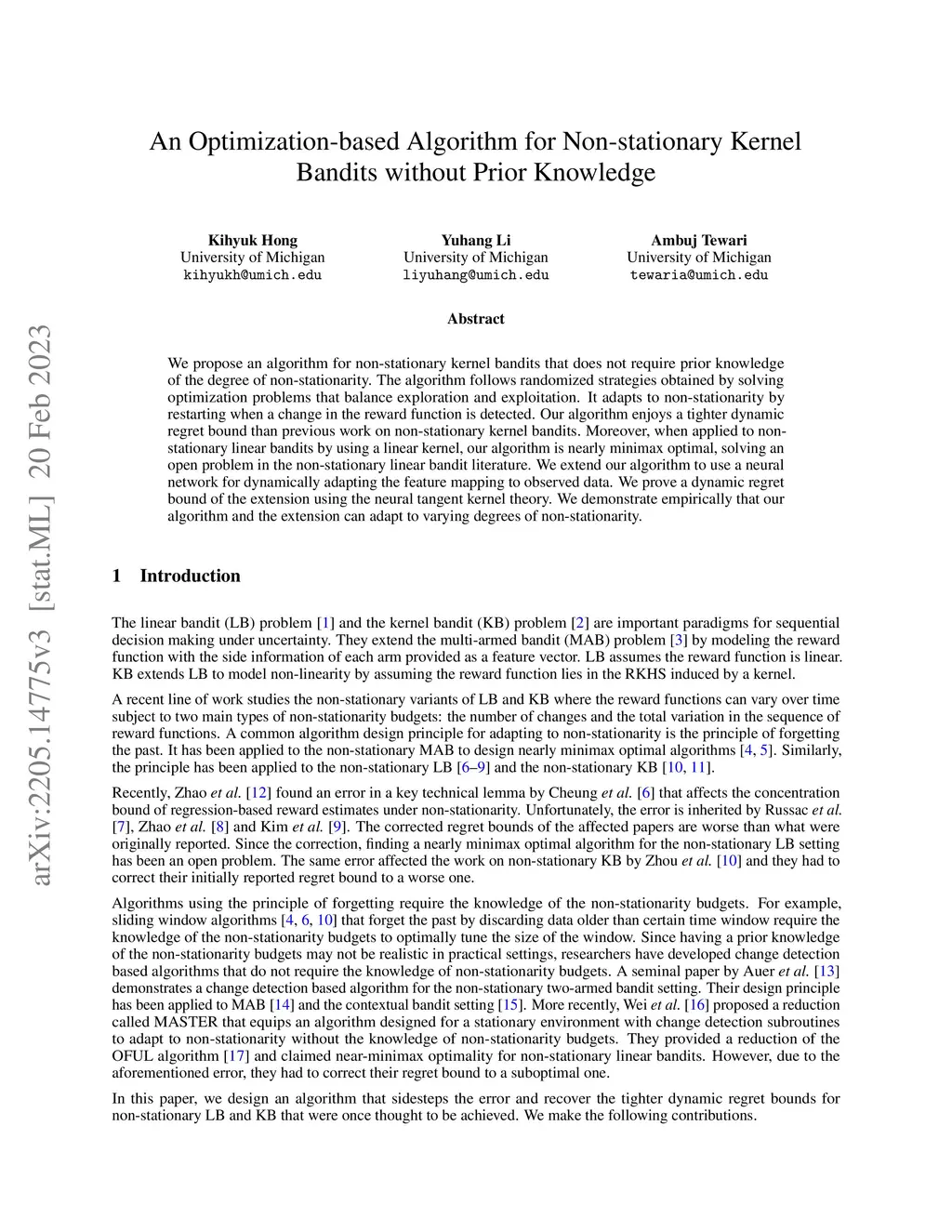 We propose an algorithm for non-stationary kernel bandits that does not require prior knowledge of the degree of non-stationarity. The algorithm follows randomized strategies obtained by solving optimization problems that balance exploration and exploitation. It adapts to non-stationarity by restarting when a change in the reward function is detected. Our algorithm enjoys a tighter dynamic regret bound than previous work on the non-stationary kernel bandit setting. Moreover, when applied to the non-stationary linear bandit setting by using a linear kernel, our algorithm is nearly minimax optimal, solving an open problem in the non-stationary linear bandit literature. We extend our algorithm to use a neural network for dynamically adapting the feature mapping to observed data. We prove a dynamic regret bound of the extension using the neural tangent kernel theory. We demonstrate empirically that our algorithm and the extension can adapt to varying degrees of non-stationarity.