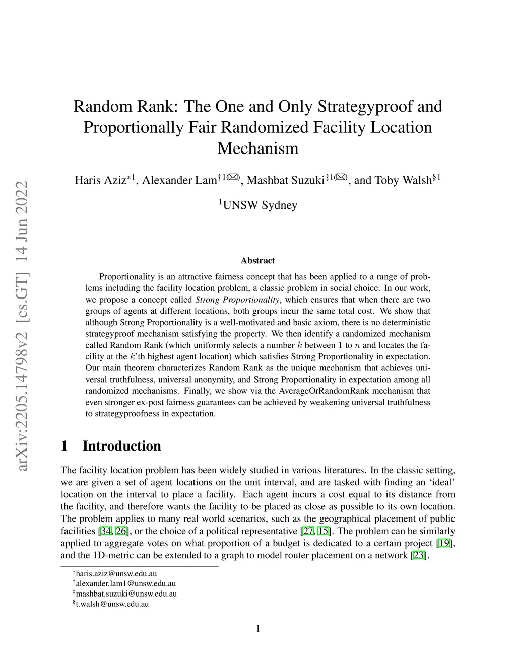 Proportionality is an attractive fairness concept that has been applied to a range of problems including the facility location problem, a classic problem in social choice. In our work, we propose a concept called Strong Proportionality, which ensures that when there are two groups of agents at different locations, both groups incur the same total cost. We show that although Strong Proportionality is a well-motivated and basic axiom, there is no deterministic strategyproof mechanism satisfying the property. We then identify a randomized mechanism called Random Rank (which uniformly selects a number between to and locates the facility at the 'th highest agent location) which satisfies Strong Proportionality in expectation. Our main theorem characterizes Random Rank as the unique mechanism that achieves universal truthfulness, universal anonymity, and Strong Proportionality in expectation among all randomized mechanisms. Finally, we show via the AverageOrRandomRank mechanism that even stronger ex-post fairness guarantees can be achieved by weakening universal truthfulness to strategyproofness in expectation.
