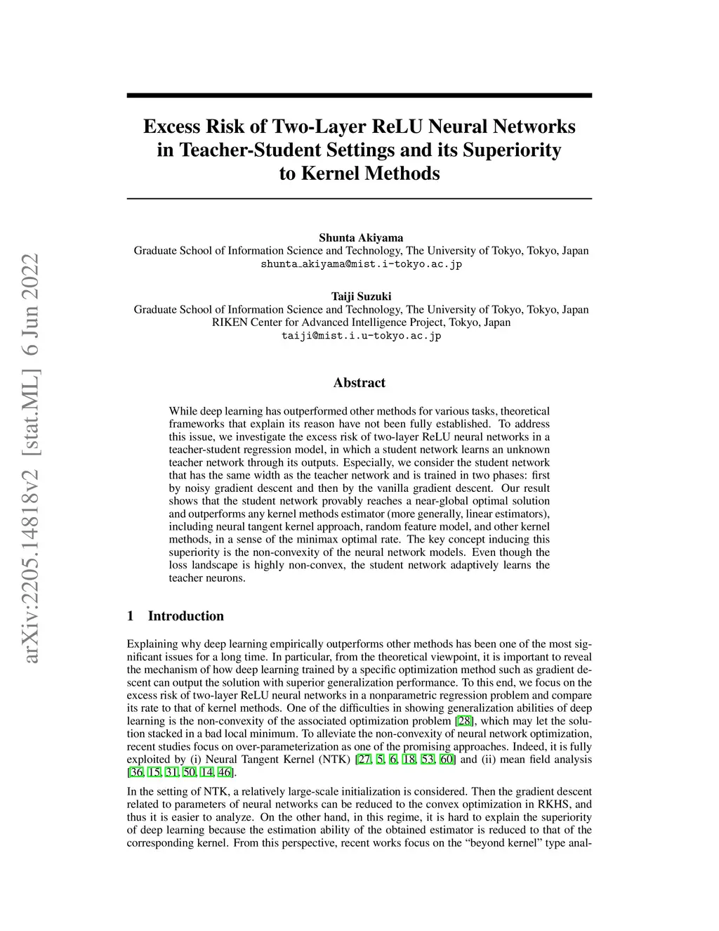 While deep learning has outperformed other methods for various tasks, theoretical frameworks that explain its reason have not been fully established. To address this issue, we investigate the excess risk of two-layer ReLU neural networks in a teacher-student regression model, in which a student network learns an unknown teacher network through its outputs. Especially, we consider the student network that has the same width as the teacher network and is trained in two phases: first by noisy gradient descent and then by the vanilla gradient descent. Our result shows that the student network provably reaches a near-global optimal solution and outperforms any kernel methods estimator (more generally, linear estimators), including neural tangent kernel approach, random feature model, and other kernel methods, in a sense of the minimax optimal rate. The key concept inducing this superiority is the non-convexity of the neural network models. Even though the loss landscape is highly non-convex, the student network adaptively learns the teacher neurons.