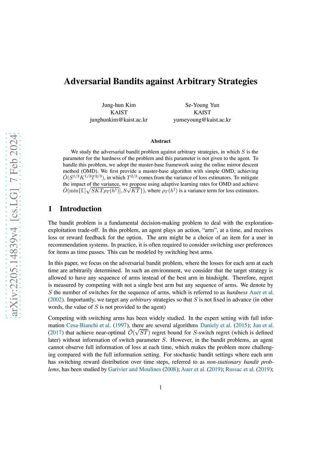 We study the adversarial bandit problem under number of switching best arms for unknown . For handling this problem, we adopt the master-base framework using the online mirror descent method (OMD). We first provide a master-base algorithm with basic OMD, achieving . For improving the regret bound with respect to , we propose to use adaptive learning rates for OMD to control variance of loss estimators, and achieve , where is a variance term for loss estimators.