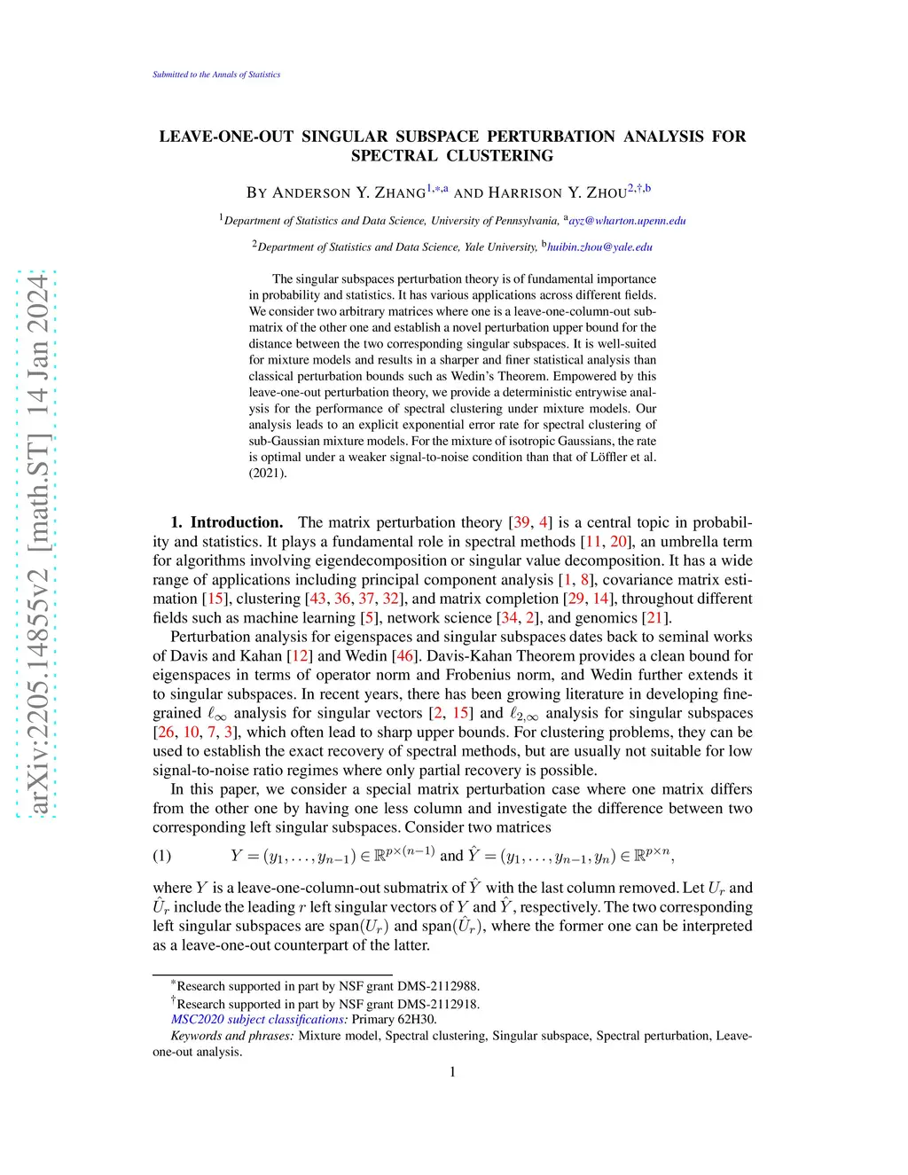 The singular subspaces perturbation theory is of fundamental importance in probability and statistics. It has various applications across different fields. We consider two arbitrary matrices where one is a leave-one-column-out submatrix of the other one and establish a novel perturbation upper bound for the distance between the two corresponding singular subspaces. It is well-suited for mixture models and results in a sharper and finer statistical analysis than classical perturbation bounds such as Wedin's Theorem. Empowered by this leave-one-out perturbation theory, we provide a deterministic entrywise analysis for the performance of spectral clustering under mixture models. Our analysis leads to an explicit exponential error rate for spectral clustering of sub-Gaussian mixture models. For the mixture of isotropic Gaussians, the rate is optimal under a weaker signal-to-noise condition than that of L{\"o}ffler et al. (2021).
