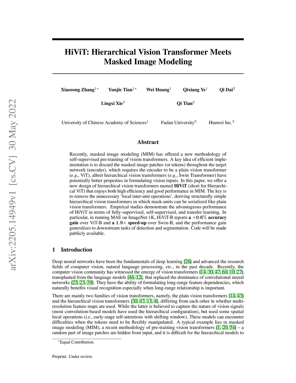 Recently, masked image modeling (MIM) has offered a new methodology of self-supervised pre-training of vision transformers. A key idea of efficient implementation is to discard the masked image patches (or tokens) throughout the target network (encoder), which requires the encoder to be a plain vision transformer (e.g., ViT), albeit hierarchical vision transformers (e.g., Swin Transformer) have potentially better properties in formulating vision inputs. In this paper, we offer a new design of hierarchical vision transformers named HiViT (short for Hierarchical ViT) that enjoys both high efficiency and good performance in MIM. The key is to remove the unnecessary "local inter-unit operations", deriving structurally simple hierarchical vision transformers in which mask-units can be serialized like plain vision transformers. For this purpose, we start with Swin Transformer and (i) set the masking unit size to be the token size in the main stage of Swin Transformer, (ii) switch off inter-unit self-attentions before the main stage, and (iii) eliminate all operations after the main stage. Empirical studies demonstrate the advantageous performance of HiViT in terms of fully-supervised, self-supervised, and transfer learning. In particular, in running MAE on ImageNet-1K, HiViT-B reports a +0.6% accuracy gain over ViT-B and a 1.9 speed-up over Swin-B, and the performance gain generalizes to downstream tasks of detection and segmentation. Code will be made publicly available.