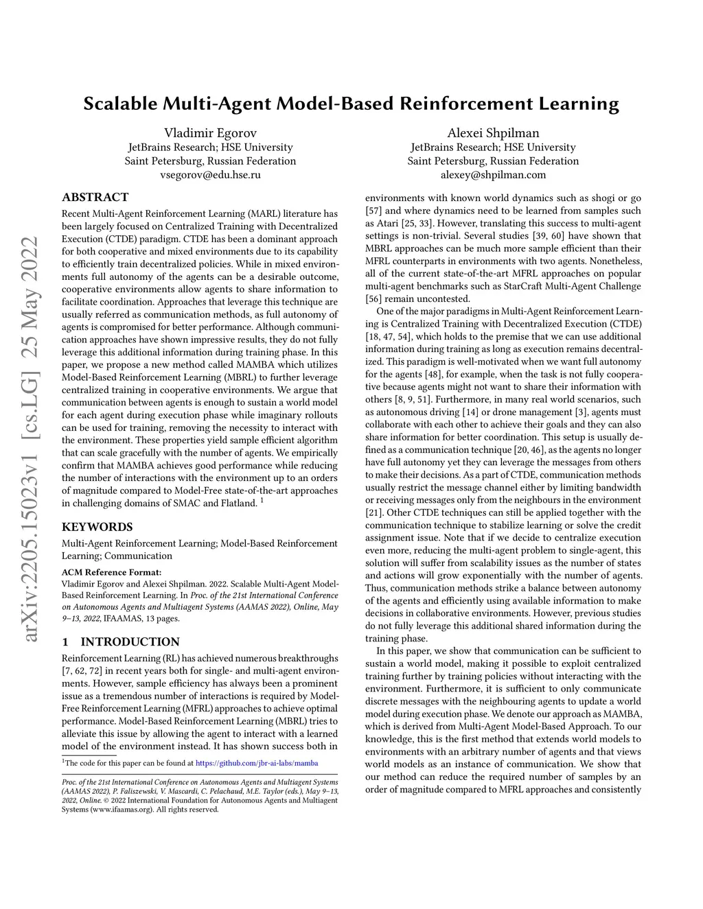 Recent Multi-Agent Reinforcement Learning (MARL) literature has been largely focused on Centralized Training with Decentralized Execution (CTDE) paradigm. CTDE has been a dominant approach for both cooperative and mixed environments due to its capability to efficiently train decentralized policies. While in mixed environments full autonomy of the agents can be a desirable outcome, cooperative environments allow agents to share information to facilitate coordination. Approaches that leverage this technique are usually referred as communication methods, as full autonomy of agents is compromised for better performance. Although communication approaches have shown impressive results, they do not fully leverage this additional information during training phase. In this paper, we propose a new method called MAMBA which utilizes Model-Based Reinforcement Learning (MBRL) to further leverage centralized training in cooperative environments. We argue that communication between agents is enough to sustain a world model for each agent during execution phase while imaginary rollouts can be used for training, removing the necessity to interact with the environment. These properties yield sample efficient algorithm that can scale gracefully with the number of agents. We empirically confirm that MAMBA achieves good performance while reducing the number of interactions with the environment up to an orders of magnitude compared to Model-Free state-of-the-art approaches in challenging domains of SMAC and Flatland.