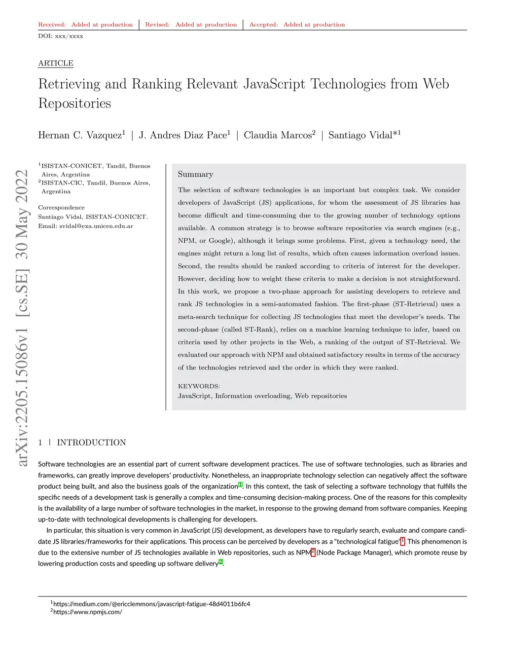 The selection of software technologies is an important but complex task. We consider developers of JavaScript (JS) applications, for whom the assessment of JS libraries has become difficult and time-consuming due to the growing number of technology options available. A common strategy is to browse software repositories via search engines (e.g., NPM, or Google), although it brings some problems. First, given a technology need, the engines might return a long list of results, which often causes information overload issues. Second, the results should be ranked according to criteria of interest for the developer. However, deciding how to weight these criteria to make a decision is not straightforward. In this work, we propose a two-phase approach for assisting developers to retrieve and rank JS technologies in a semi-automated fashion. The first-phase (ST-Retrieval) uses a meta-search technique for collecting JS technologies that meet the developer's needs. The second-phase (called ST-Rank), relies on a machine learning technique to infer, based on criteria used by other projects in the Web, a ranking of the output of ST-Retrieval. We evaluated our approach with NPM and obtained satisfactory results in terms of the accuracy of the technologies retrieved and the order in which they were ranked.