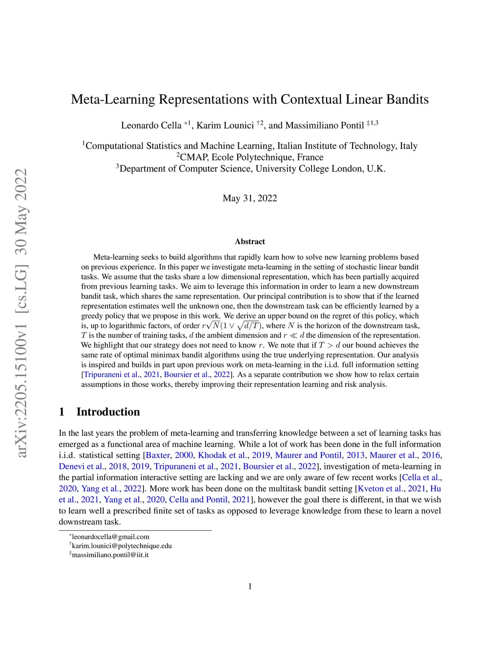 Meta-learning seeks to build algorithms that rapidly learn how to solve new learning problems based on previous experience. In this paper we investigate meta-learning in the setting of stochastic linear bandit tasks. We assume that the tasks share a low dimensional representation, which has been partially acquired from previous learning tasks. We aim to leverage this information in order to learn a new downstream bandit task, which shares the same representation. Our principal contribution is to show that if the learned representation estimates well the unknown one, then the downstream task can be efficiently learned by a greedy policy that we propose in this work. We derive an upper bound on the regret of this policy, which is, up to logarithmic factors, of order , where is the horizon of the downstream task, is the number of training tasks, the ambient dimension and the dimension of the representation. We highlight that our strategy does not need to know . We note that if our bound achieves the same rate of optimal minimax bandit algorithms using the true underlying representation. Our analysis is inspired and builds in part upon previous work on meta-learning in the i.i.d. full information setting \citep{tripuraneni2021provable,boursier2022trace}. As a separate contribution we show how to relax certain assumptions in those works, thereby improving their representation learning and risk analysis.