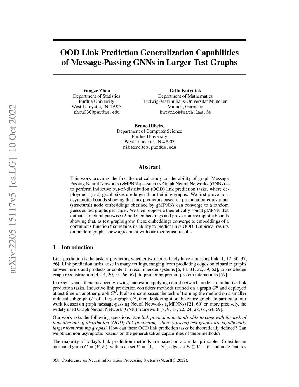 This work provides the first theoretical study on the ability of graph Message Passing Neural Networks (gMPNNs) -- such as Graph Neural Networks (GNNs) -- to perform inductive out-of-distribution (OOD) link prediction tasks, where deployment (test) graph sizes are larger than training graphs. We first prove non-asymptotic bounds showing that link predictors based on permutation-equivariant (structural) node embeddings obtained by gMPNNs can converge to a random guess as test graphs get larger. We then propose a theoretically-sound gMPNN that outputs structural pairwise (2-node) embeddings and prove non-asymptotic bounds showing that, as test graphs grow, these embeddings converge to embeddings of a continuous function that retains its ability to predict links OOD. Empirical results on random graphs show agreement with our theoretical results.