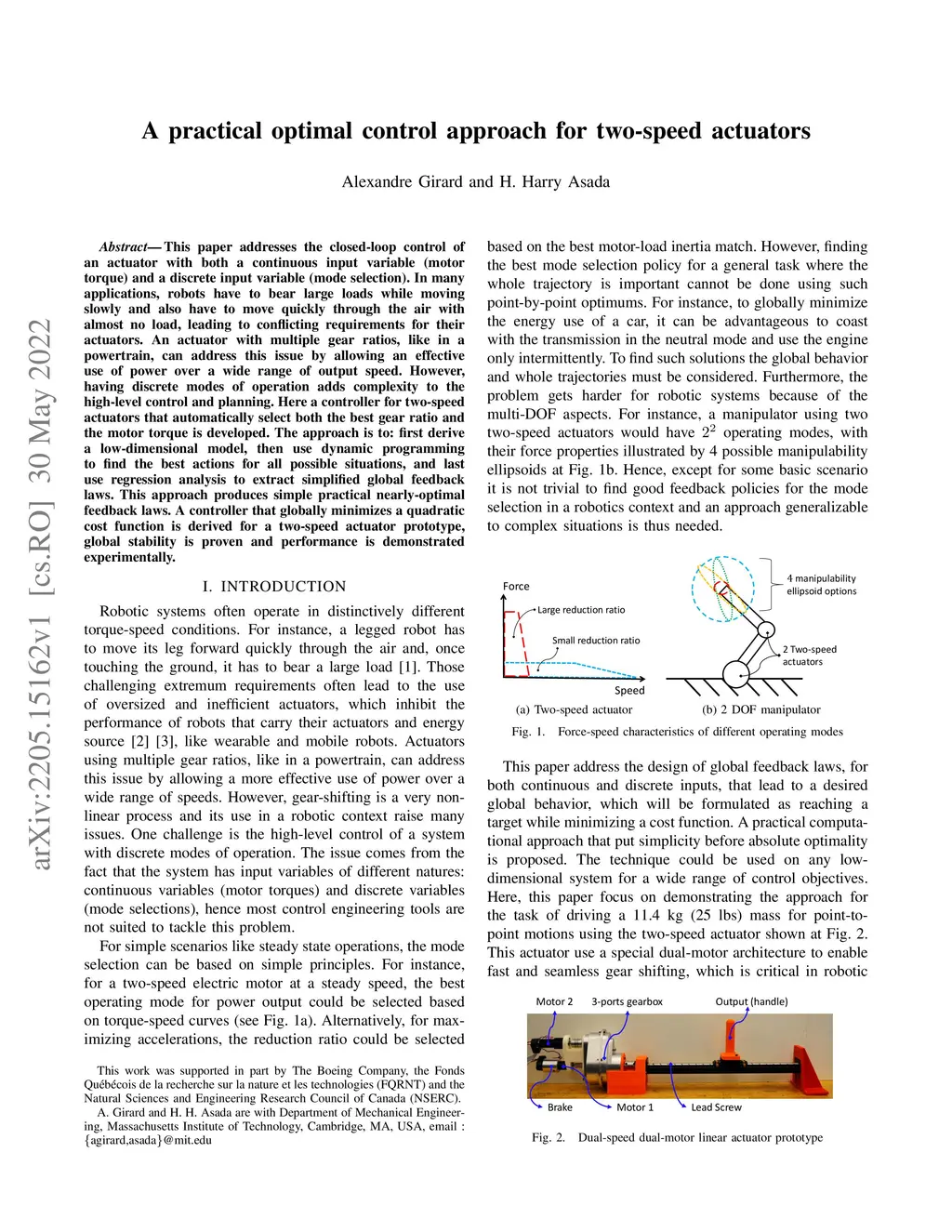 This paper addresses the closed-loop control of an actuator with both a continuous input variable (motor torque) and a discrete input variable (mode selection). In many applications, robots have to bear large loads while moving slowly and also have to move quickly through the air with almost no load, leading to conflicting requirements for their actuators. An actuator with multiple gear ratios, like in a powertrain, can address this issue by allowing an effective use of power over a wide range of output speed. However, having discrete modes of operation adds complexity to the high-level control and planning. Here a controller for two-speed actuators that automatically select both the best gear ratio and the motor torque is developed. The approach is to: first derive a low-dimensional model, then use dynamic programming to find the best actions for all possible situations, and last use regression analysis to extract simplified global feedback laws. This approach produces simple practical nearly-optimal feedback laws. A controller that globally minimizes a quadratic cost function is derived for a two-speed actuator prototype, global stability is proven and performance is demonstrated experimentally.