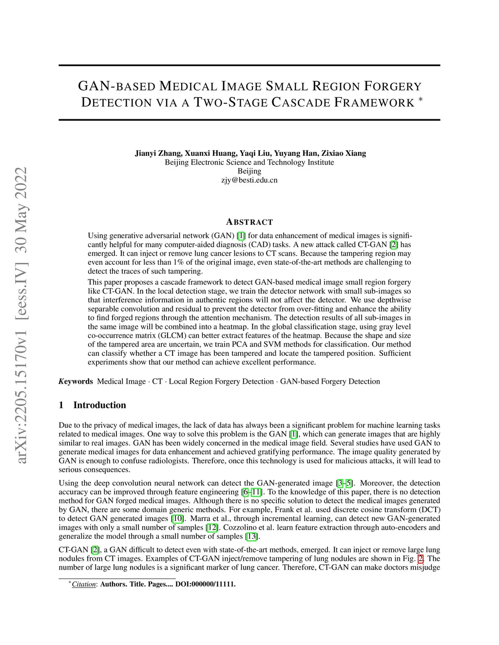 Using generative adversarial network (GAN)\cite{RN90} for data enhancement of medical images is significantly helpful for many computer-aided diagnosis (CAD) tasks. A new attack called CT-GAN has emerged. It can inject or remove lung cancer lesions to CT scans. Because the tampering region may even account for less than 1\% of the original image, even state-of-the-art methods are challenging to detect the traces of such tampering. This paper proposes a cascade framework to detect GAN-based medical image small region forgery like CT-GAN. In the local detection stage, we train the detector network with small sub-images so that interference information in authentic regions will not affect the detector. We use depthwise separable convolution and residual to prevent the detector from over-fitting and enhance the ability to find forged regions through the attention mechanism. The detection results of all sub-images in the same image will be combined into a heatmap. In the global classification stage, using gray level co-occurrence matrix (GLCM) can better extract features of the heatmap. Because the shape and size of the tampered area are uncertain, we train PCA and SVM methods for classification. Our method can classify whether a CT image has been tampered and locate the tampered position. Sufficient experiments show that our method can achieve excellent performance.