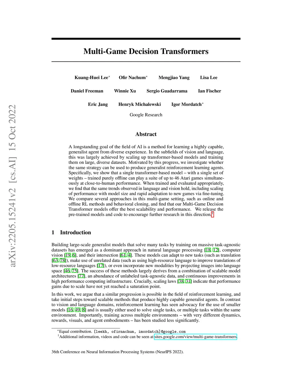 A longstanding goal of the field of AI is a method for learning a highly capable, generalist agent from diverse experience. In the subfields of vision and language, this was largely achieved by scaling up transformer-based models and training them on large, diverse datasets. Motivated by this progress, we investigate whether the same strategy can be used to produce generalist reinforcement learning agents. Specifically, we show that a single transformer-based model - with a single set of weights - trained purely offline can play a suite of up to 46 Atari games simultaneously at close-to-human performance. When trained and evaluated appropriately, we find that the same trends observed in language and vision hold, including scaling of performance with model size and rapid adaptation to new games via fine-tuning. We compare several approaches in this multi-game setting, such as online and offline RL methods and behavioral cloning, and find that our Multi-Game Decision Transformer models offer the best scalability and performance. We release the pre-trained models and code to encourage further research in this direction.