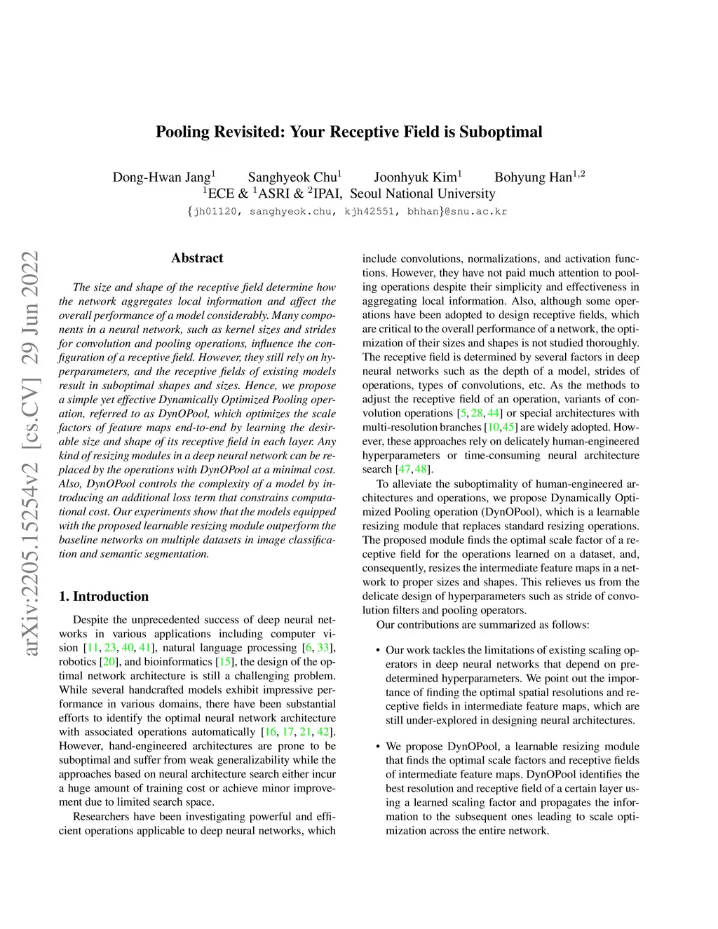 The size and shape of the receptive field determine how the network aggregates local information and affect the overall performance of a model considerably. Many components in a neural network, such as kernel sizes and strides for convolution and pooling operations, influence the configuration of a receptive field. However, they still rely on hyperparameters, and the receptive fields of existing models result in suboptimal shapes and sizes. Hence, we propose a simple yet effective Dynamically Optimized Pooling operation, referred to as DynOPool, which optimizes the scale factors of feature maps end-to-end by learning the desirable size and shape of its receptive field in each layer. Any kind of resizing modules in a deep neural network can be replaced by the operations with DynOPool at a minimal cost. Also, DynOPool controls the complexity of a model by introducing an additional loss term that constrains computational cost. Our experiments show that the models equipped with the proposed learnable resizing module outperform the baseline networks on multiple datasets in image classification and semantic segmentation.