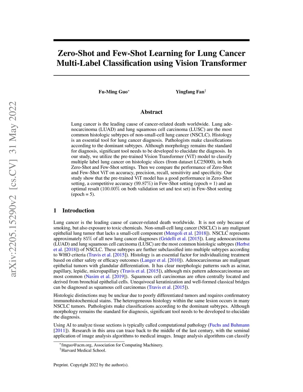 Lung cancer is the leading cause of cancer-related death worldwide. Lung adenocarcinoma (LUAD) and lung squamous cell carcinoma (LUSC) are the most common histologic subtypes of non-small-cell lung cancer (NSCLC). Histology is an essential tool for lung cancer diagnosis. Pathologists make classifications according to the dominant subtypes. Although morphology remains the standard for diagnosis, significant tool needs to be developed to elucidate the diagnosis. In our study, we utilize the pre-trained Vision Transformer (ViT) model to classify multiple label lung cancer on histologic slices (from dataset LC25000), in both Zero-Shot and Few-Shot settings. Then we compare the performance of Zero-Shot and Few-Shot ViT on accuracy, precision, recall, sensitivity and specificity. Our study show that the pre-trained ViT model has a good performance in Zero-Shot setting, a competitive accuracy () in Few-Shot setting ({epoch = 1}) and an optimal result ( on both validation set and test set) in Few-Shot seeting ({epoch = 5}).