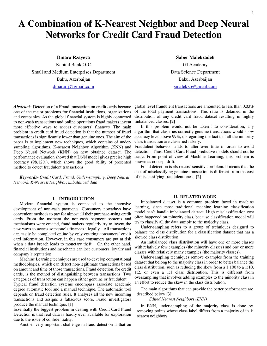 Detection of a Fraud transaction on credit cards became one of the major problems for financial institutions, organizations and companies. As the global financial system is highly connected to non-cash transactions and online operations fraud makers invent more effective ways to access customers' finances. The main problem in credit card fraud detection is that the number of fraud transactions is significantly lower than genuine ones. The aim of the paper is to implement new techniques, which contains of under-sampling algorithms, K-nearest Neighbor Algorithm (KNN) and Deep Neural Network (KNN) on new obtained dataset. The performance evaluation showed that DNN model gives precise high accuracy (98.12%), which shows the good ability of presented method to detect fraudulent transactions.