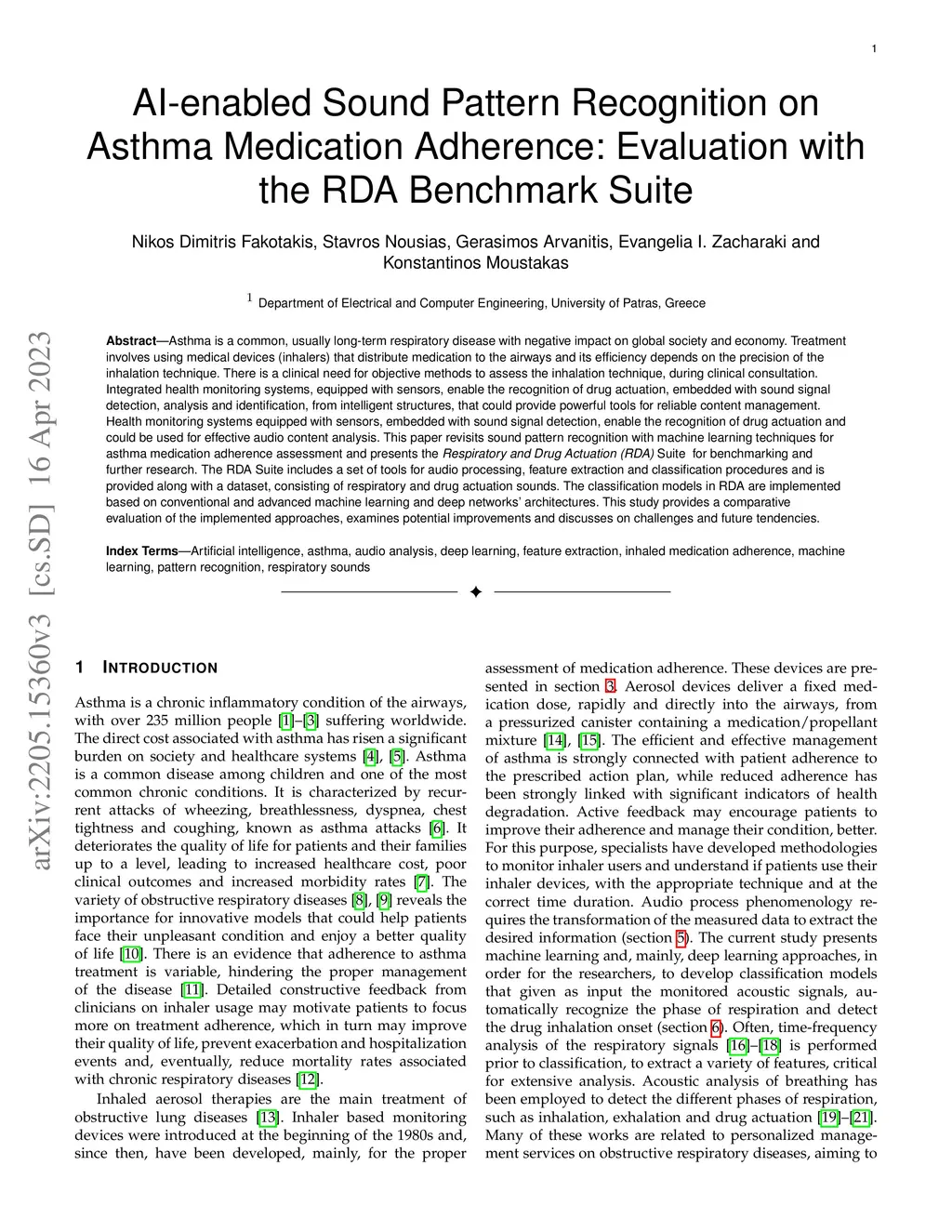Asthma is a common, usually long-term respiratory disease with negative impact on global society and economy. Treatment involves using medical devices (inhalers) that distribute medication to the airways and its efficiency depends on the precision of the inhalation technique. There is a clinical need for objective methods to assess the inhalation technique, during clinical consultation. Integrated health monitoring systems, equipped with sensors, enable the recognition of drug actuation, embedded with sound signal detection, analysis and identification, from intelligent structures, that could provide powerful tools for reliable content management. Health monitoring systems equipped with sensors, embedded with sound signal detection, enable the recognition of drug actuation and could be used for effective audio content analysis. This paper revisits sound pattern recognition with machine learning techniques for asthma medication adherence assessment and presents the Respiratory and Drug Actuation (RDA) Suite (https://gitlab.com/vvr/monitoring-medication-adherence/rda-benchmark) for benchmarking and further research. The RDA Suite includes a set of tools for audio processing, feature extraction and classification procedures and is provided along with a dataset, consisting of respiratory and drug actuation sounds. The classification models in RDA are implemented based on conventional and advanced machine learning and deep networks' architectures. This study provides a comparative evaluation of the implemented approaches, examines potential improvements and discusses on challenges and future tendencies.