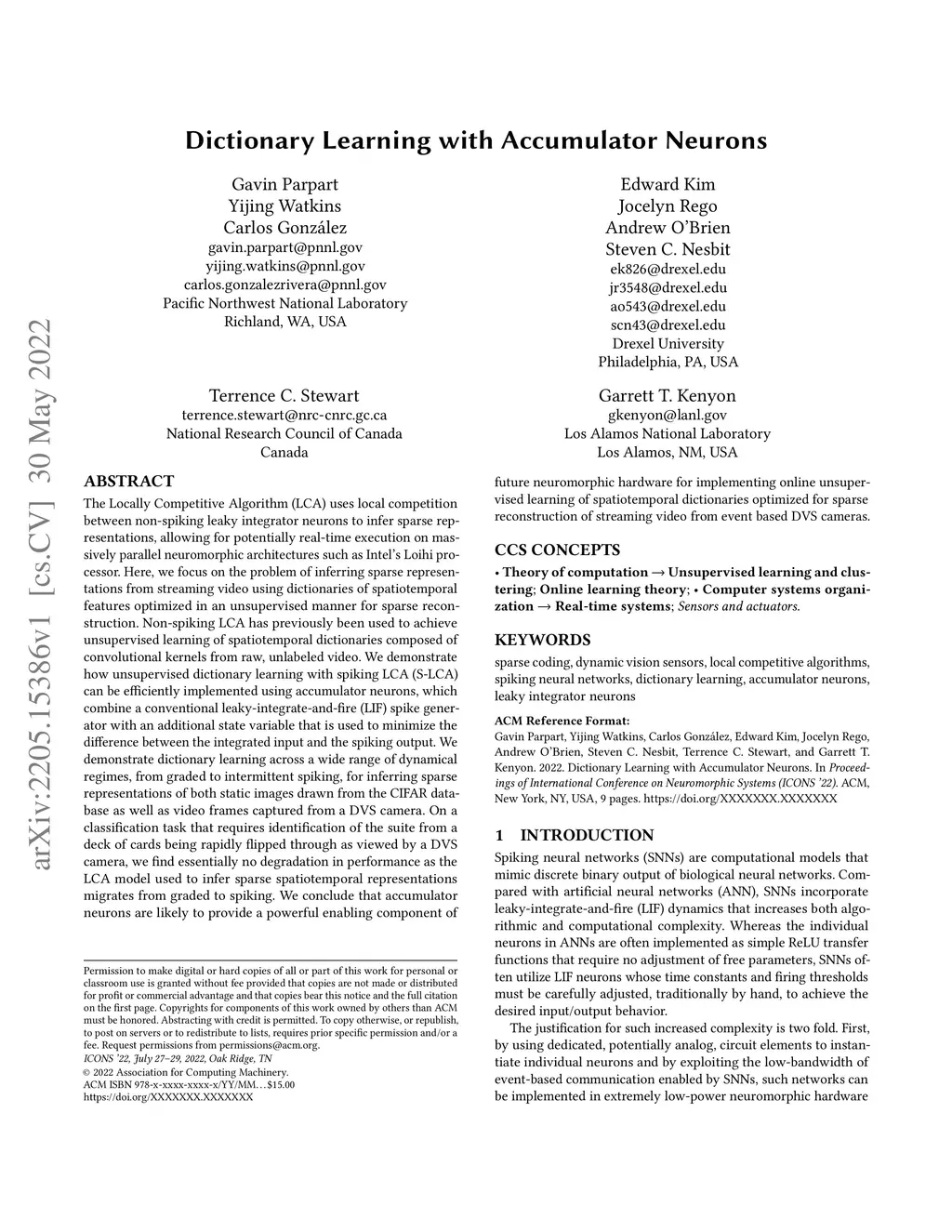 The Locally Competitive Algorithm (LCA) uses local competition between non-spiking leaky integrator neurons to infer sparse representations, allowing for potentially real-time execution on massively parallel neuromorphic architectures such as Intel's Loihi processor. Here, we focus on the problem of inferring sparse representations from streaming video using dictionaries of spatiotemporal features optimized in an unsupervised manner for sparse reconstruction. Non-spiking LCA has previously been used to achieve unsupervised learning of spatiotemporal dictionaries composed of convolutional kernels from raw, unlabeled video. We demonstrate how unsupervised dictionary learning with spiking LCA (\hbox{S-LCA}) can be efficiently implemented using accumulator neurons, which combine a conventional leaky-integrate-and-fire (\hbox{LIF}) spike generator with an additional state variable that is used to minimize the difference between the integrated input and the spiking output. We demonstrate dictionary learning across a wide range of dynamical regimes, from graded to intermittent spiking, for inferring sparse representations of both static images drawn from the CIFAR database as well as video frames captured from a DVS camera. On a classification task that requires identification of the suite from a deck of cards being rapidly flipped through as viewed by a DVS camera, we find essentially no degradation in performance as the LCA model used to infer sparse spatiotemporal representations migrates from graded to spiking. We conclude that accumulator neurons are likely to provide a powerful enabling component of future neuromorphic hardware for implementing online unsupervised learning of spatiotemporal dictionaries optimized for sparse reconstruction of streaming video from event based DVS cameras.
