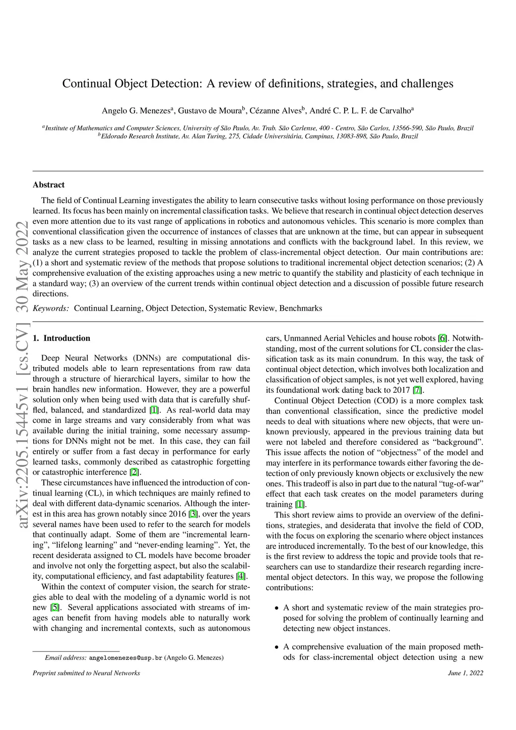 The field of Continual Learning investigates the ability to learn consecutive tasks without losing performance on those previously learned. Its focus has been mainly on incremental classification tasks. We believe that research in continual object detection deserves even more attention due to its vast range of applications in robotics and autonomous vehicles. This scenario is more complex than conventional classification given the occurrence of instances of classes that are unknown at the time, but can appear in subsequent tasks as a new class to be learned, resulting in missing annotations and conflicts with the background label. In this review, we analyze the current strategies proposed to tackle the problem of class-incremental object detection. Our main contributions are: (1) a short and systematic review of the methods that propose solutions to traditional incremental object detection scenarios; (2) A comprehensive evaluation of the existing approaches using a new metric to quantify the stability and plasticity of each technique in a standard way; (3) an overview of the current trends within continual object detection and a discussion of possible future research directions.