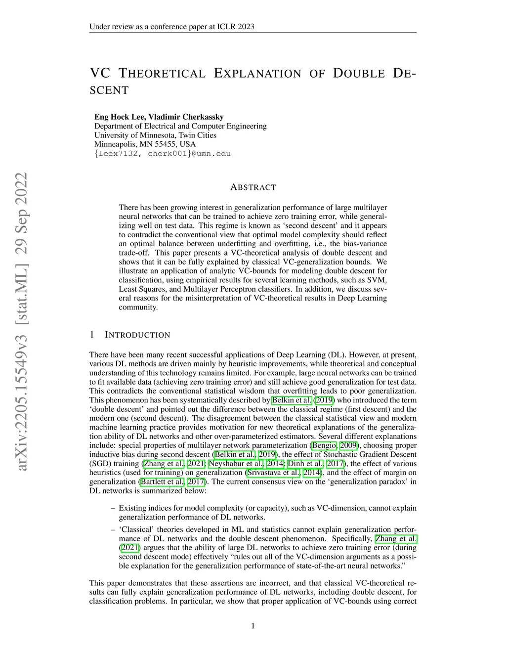 There has been growing interest in generalization performance of large multilayer neural networks that can be trained to achieve zero training error, while generalizing well on test data. This regime is known as 'second descent' and it appears to contradict the conventional view that optimal model complexity should reflect an optimal balance between underfitting and overfitting, i.e., the bias-variance trade-off. This paper presents a VC-theoretical analysis of double descent and shows that it can be fully explained by classical VC-generalization bounds. We illustrate an application of analytic VC-bounds for modeling double descent for classification, using empirical results for several learning methods, such as SVM, Least Squares, and Multilayer Perceptron classifiers. In addition, we discuss several reasons for the misinterpretation of VC-theoretical results in Deep Learning community.