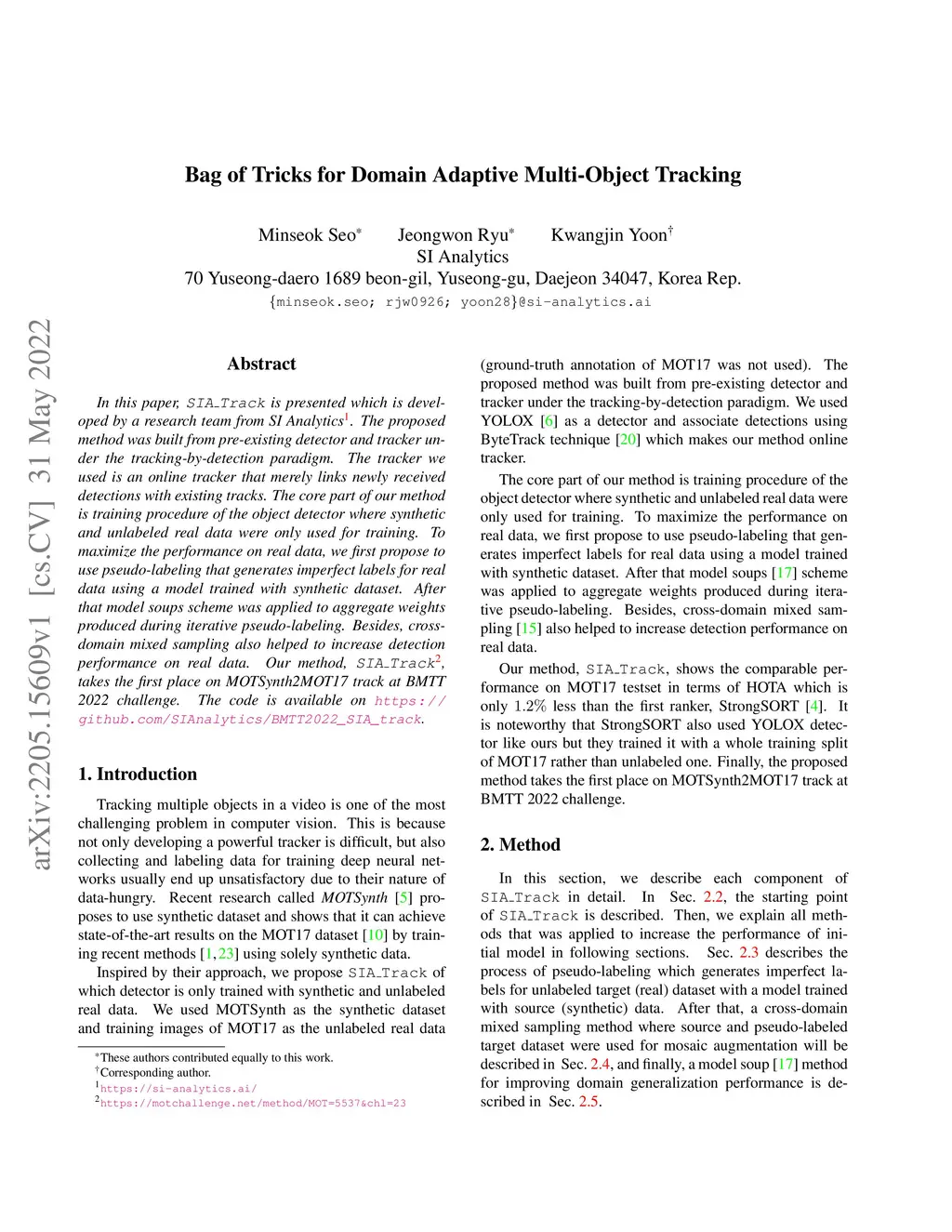 In this paper, SIA_Track is presented which is developed by a research team from SI Analytics. The proposed method was built from pre-existing detector and tracker under the tracking-by-detection paradigm. The tracker we used is an online tracker that merely links newly received detections with existing tracks. The core part of our method is training procedure of the object detector where synthetic and unlabeled real data were only used for training. To maximize the performance on real data, we first propose to use pseudo-labeling that generates imperfect labels for real data using a model trained with synthetic dataset. After that model soups scheme was applied to aggregate weights produced during iterative pseudo-labeling. Besides, cross-domain mixed sampling also helped to increase detection performance on real data. Our method, SIA_Track, takes the first place on MOTSynth2MOT17 track at BMTT 2022 challenge. The code is available on https://github.com/SIAnalytics/BMTT2022_SIA_track.