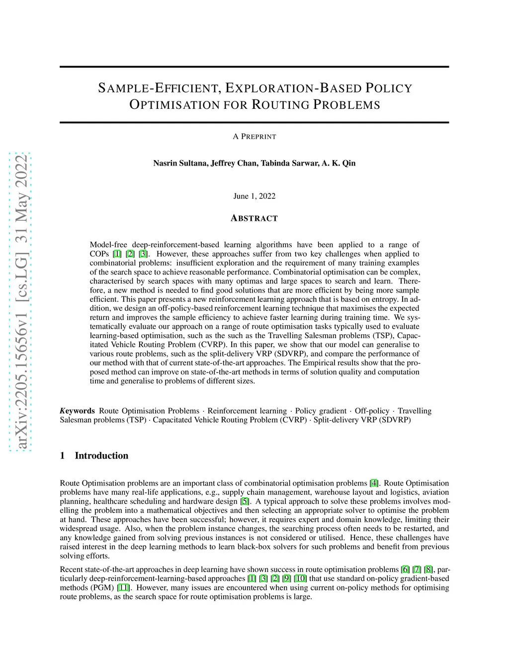 Model-free deep-reinforcement-based learning algorithms have been applied to a range of COPs~\cite{bello2016neural}~\cite{kool2018attention}~\cite{nazari2018reinforcement}. However, these approaches suffer from two key challenges when applied to combinatorial problems: insufficient exploration and the requirement of many training examples of the search space to achieve reasonable performance. Combinatorial optimisation can be complex, characterised by search spaces with many optimas and large spaces to search and learn. Therefore, a new method is needed to find good solutions that are more efficient by being more sample efficient. This paper presents a new reinforcement learning approach that is based on entropy. In addition, we design an off-policy-based reinforcement learning technique that maximises the expected return and improves the sample efficiency to achieve faster learning during training time. We systematically evaluate our approach on a range of route optimisation tasks typically used to evaluate learning-based optimisation, such as the such as the Travelling Salesman problems (TSP), Capacitated Vehicle Routing Problem (CVRP). In this paper, we show that our model can generalise to various route problems, such as the split-delivery VRP (SDVRP), and compare the performance of our method with that of current state-of-the-art approaches. The Empirical results show that the proposed method can improve on state-of-the-art methods in terms of solution quality and computation time and generalise to problems of different sizes.