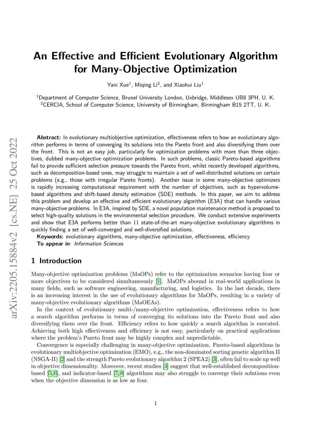 In evolutionary multiobjective optimization, effectiveness refers to how an evolutionary algorithm performs in terms of converging its solutions into the Pareto front and also diversifying them over the front. This is not an easy job, particularly for optimization problems with more than three objectives, dubbed many-objective optimization problems. In such problems, classic Pareto-based algorithms fail to provide sufficient selection pressure towards the Pareto front, whilst recently developed algorithms, such as decomposition-based ones, may struggle to maintain a set of well-distributed solutions on certain problems (e.g., those with irregular Pareto fronts). Another issue in some many-objective optimizers is rapidly increasing computational requirement with the number of objectives, such as hypervolume-based algorithms and shift-based density estimation (SDE) methods. In this paper, we aim to address this problem and develop an effective and efficient evolutionary algorithm (E3A) that can handle various many-objective problems. In E3A, inspired by SDE, a novel population maintenance method is proposed to select high-quality solutions in the environmental selection procedure. We conduct extensive experiments and show that E3A performs better than 11 state-of-the-art many-objective evolutionary algorithms in quickly finding a set of well-converged and well-diversified solutions.