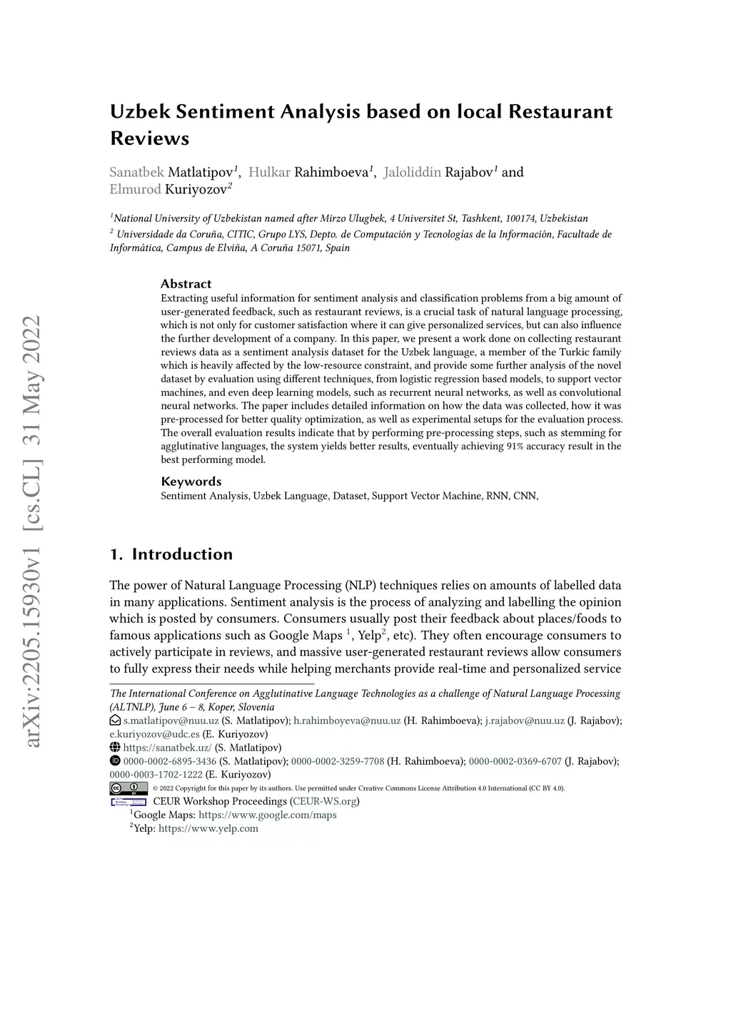 Uzbek Sentiment Analysis based on local Restaurant Reviews