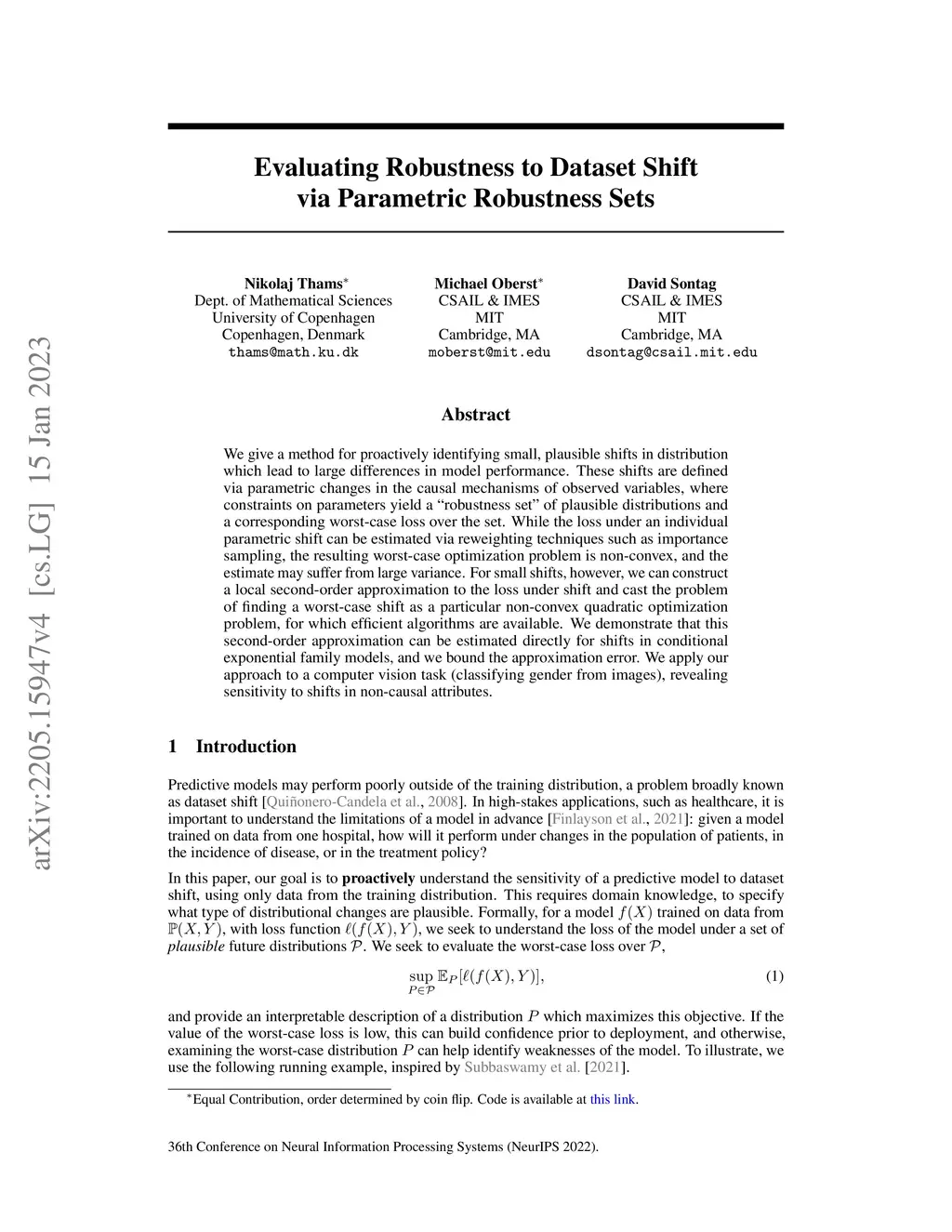 We give a method for proactively identifying small, plausible shifts in distribution which lead to large differences in model performance. These shifts are defined via parametric changes in the causal mechanisms of observed variables, where constraints on parameters yield a "robustness set" of plausible distributions and a corresponding worst-case loss over the set. While the loss under an individual parametric shift can be estimated via reweighting techniques such as importance sampling, the resulting worst-case optimization problem is non-convex, and the estimate may suffer from large variance. For small shifts, however, we can construct a local second-order approximation to the loss under shift and cast the problem of finding a worst-case shift as a particular non-convex quadratic optimization problem, for which efficient algorithms are available. We demonstrate that this second-order approximation can be estimated directly for shifts in conditional exponential family models, and we bound the approximation error. We apply our approach to a computer vision task (classifying gender from images), revealing sensitivity to shifts in non-causal attributes.