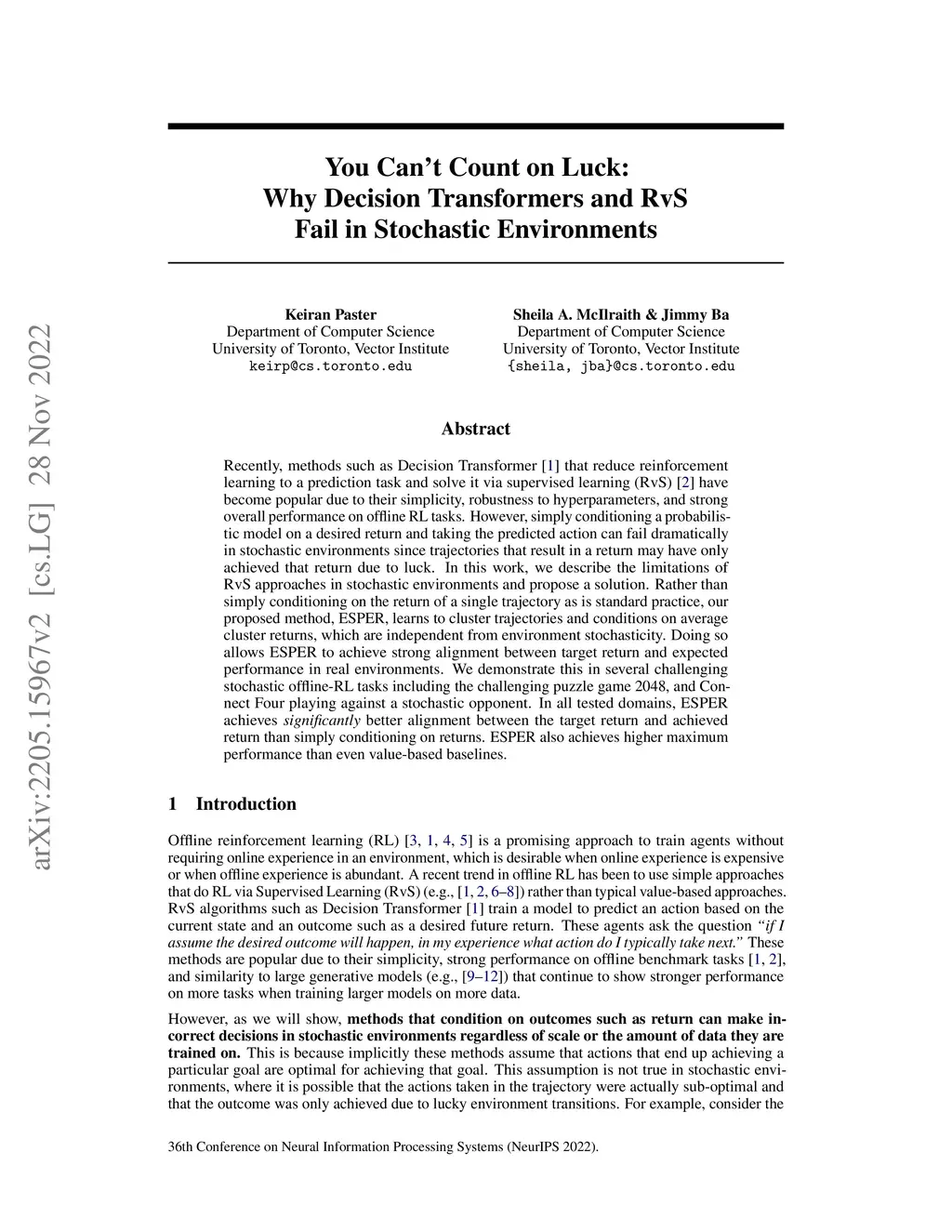 Recently, methods such as Decision Transformer that reduce reinforcement learning to a prediction task and solve it via supervised learning (RvS) have become popular due to their simplicity, robustness to hyperparameters, and strong overall performance on offline RL tasks. However, simply conditioning a probabilistic model on a desired return and taking the predicted action can fail dramatically in stochastic environments since trajectories that result in a return may have only achieved that return due to luck. In this work, we describe the limitations of RvS approaches in stochastic environments and propose a solution. Rather than simply conditioning on the return of a single trajectory as is standard practice, our proposed method, ESPER, learns to cluster trajectories and conditions on average cluster returns, which are independent from environment stochasticity. Doing so allows ESPER to achieve strong alignment between target return and expected performance in real environments. We demonstrate this in several challenging stochastic offline-RL tasks including the challenging puzzle game 2048, and Connect Four playing against a stochastic opponent. In all tested domains, ESPER achieves significantly better alignment between the target return and achieved return than simply conditioning on returns. ESPER also achieves higher maximum performance than even the value-based baselines.