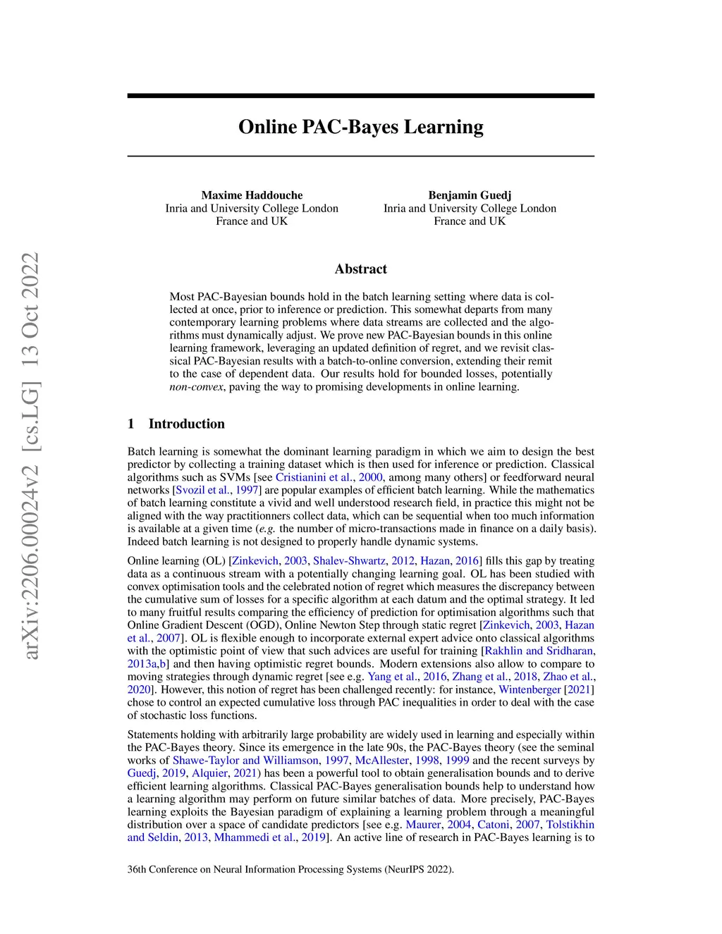 Most PAC-Bayesian bounds hold in the batch learning setting where data is collected at once, prior to inference or prediction. This somewhat departs from many contemporary learning problems where data streams are collected and the algorithms must dynamically adjust. We prove new PAC-Bayesian bounds in this online learning framework, leveraging an updated definition of regret, and we revisit classical PAC-Bayesian results with a batch-to-online conversion, extending their remit to the case of dependent data. Our results hold for bounded losses, potentially \emph{non-convex}, paving the way to promising developments in online learning.