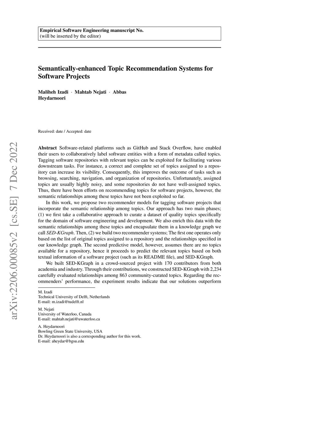 Semantically-enhanced Topic Recommendation System for Software Projects