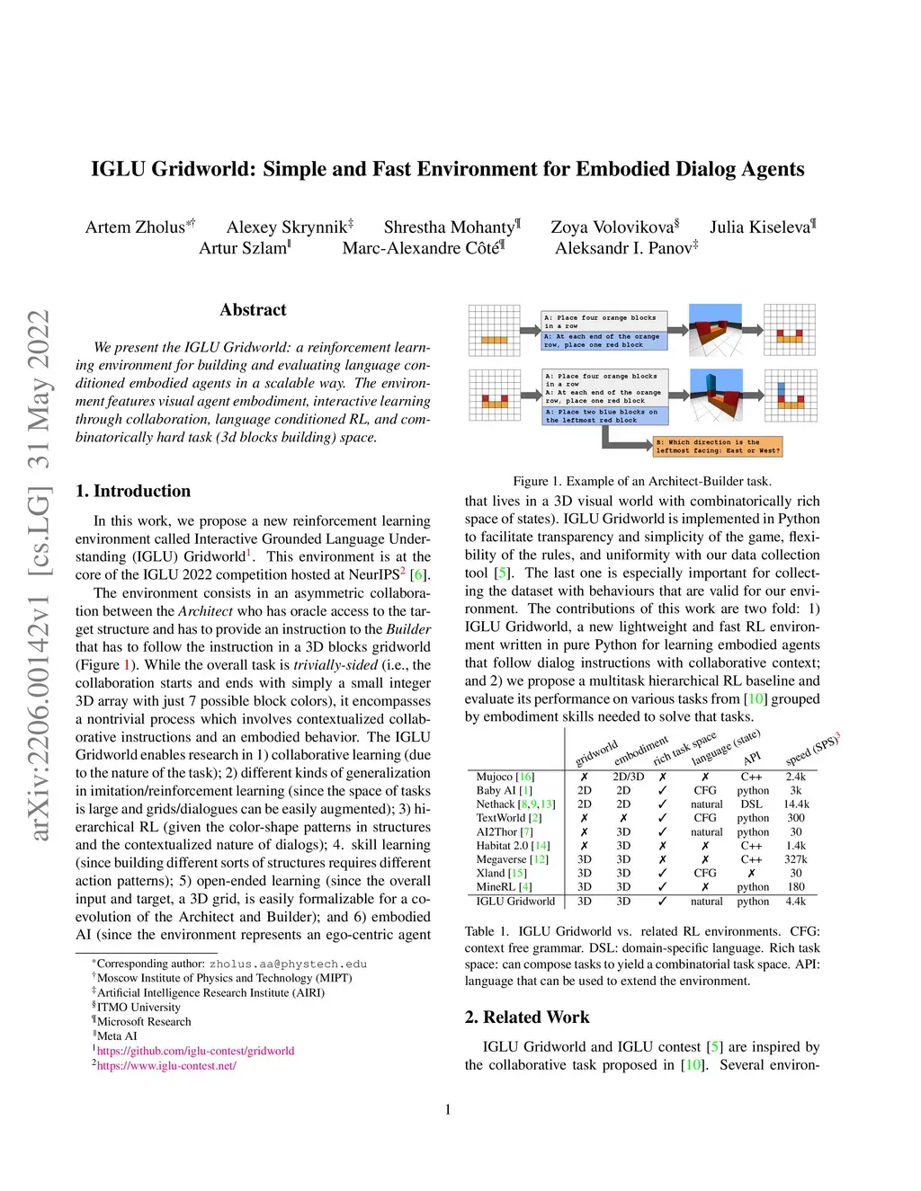 IGLU Gridworld: Simple and Fast Environment for Embodied Dialog Agents