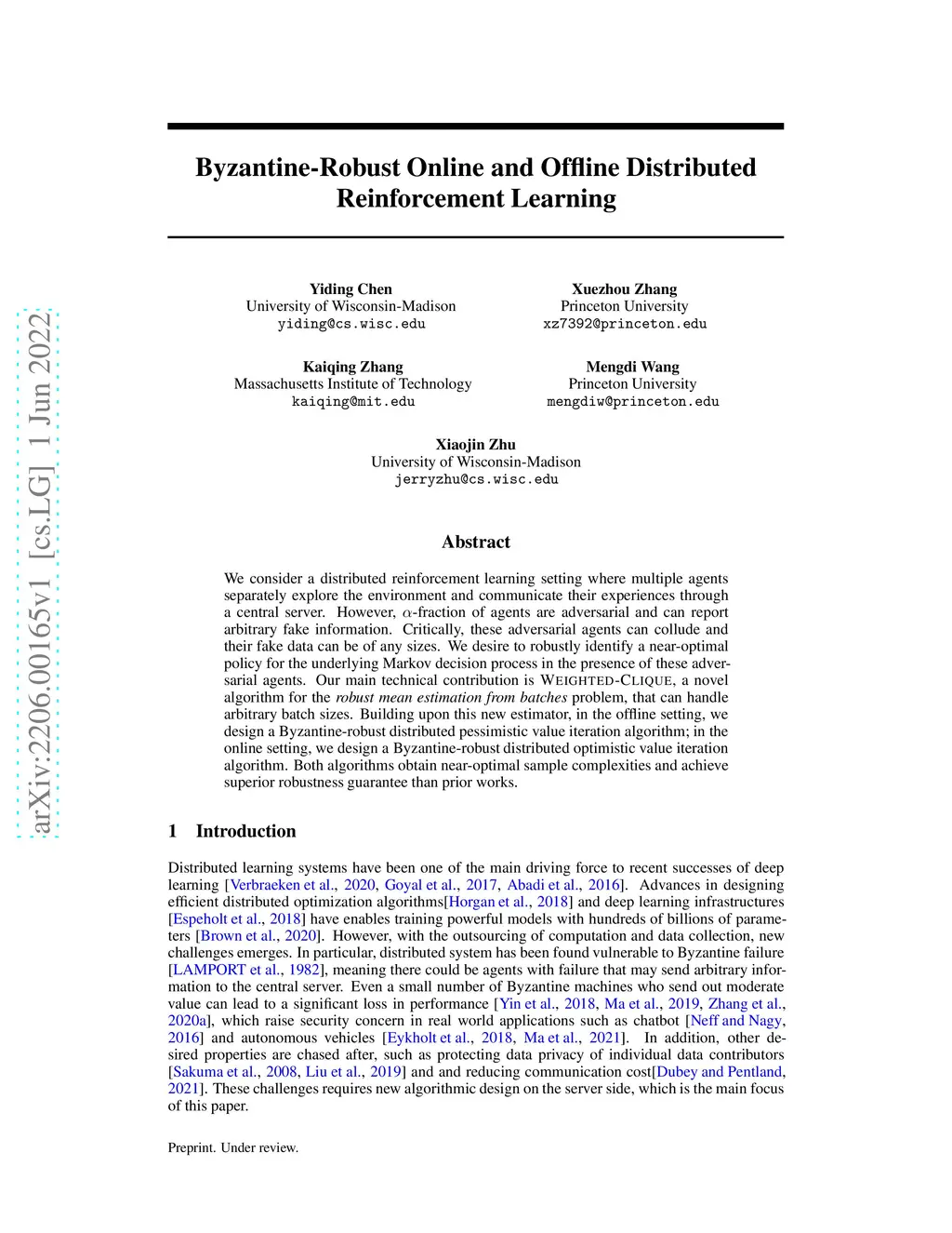 We consider a distributed reinforcement learning setting where multiple agents separately explore the environment and communicate their experiences through a central server. However, -fraction of agents are adversarial and can report arbitrary fake information. Critically, these adversarial agents can collude and their fake data can be of any sizes. We desire to robustly identify a near-optimal policy for the underlying Markov decision process in the presence of these adversarial agents. Our main technical contribution is Weighted-Clique, a novel algorithm for the robust mean estimation from batches problem, that can handle arbitrary batch sizes. Building upon this new estimator, in the offline setting, we design a Byzantine-robust distributed pessimistic value iteration algorithm; in the online setting, we design a Byzantine-robust distributed optimistic value iteration algorithm. Both algorithms obtain near-optimal sample complexities and achieve superior robustness guarantee than prior works.