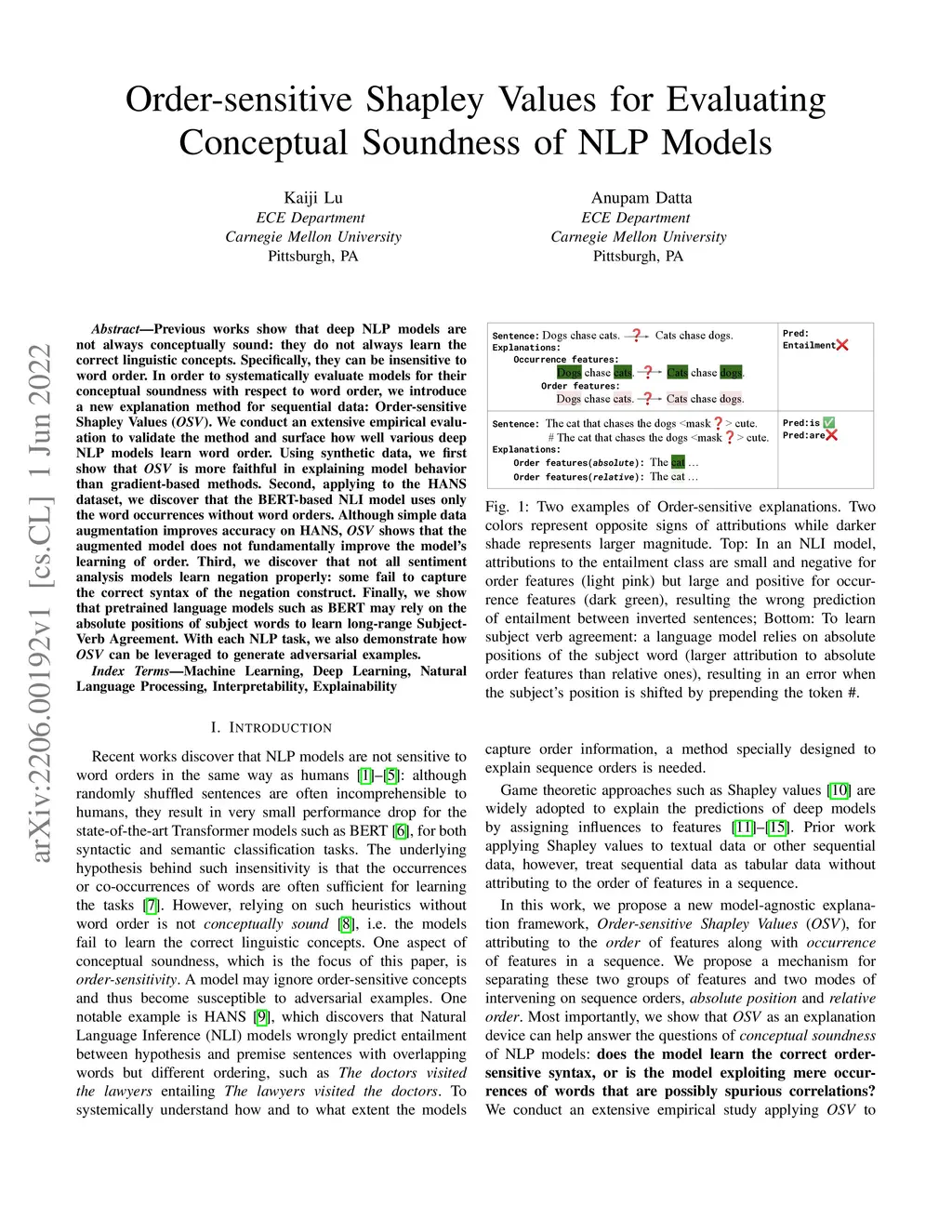 Previous works show that deep NLP models are not always conceptually sound: they do not always learn the correct linguistic concepts. Specifically, they can be insensitive to word order. In order to systematically evaluate models for their conceptual soundness with respect to word order, we introduce a new explanation method for sequential data: Order-sensitive Shapley Values (OSV). We conduct an extensive empirical evaluation to validate the method and surface how well various deep NLP models learn word order. Using synthetic data, we first show that OSV is more faithful in explaining model behavior than gradient-based methods. Second, applying to the HANS dataset, we discover that the BERT-based NLI model uses only the word occurrences without word orders. Although simple data augmentation improves accuracy on HANS, OSV shows that the augmented model does not fundamentally improve the model's learning of order. Third, we discover that not all sentiment analysis models learn negation properly: some fail to capture the correct syntax of the negation construct. Finally, we show that pretrained language models such as BERT may rely on the absolute positions of subject words to learn long-range Subject-Verb Agreement. With each NLP task, we also demonstrate how OSV can be leveraged to generate adversarial examples.