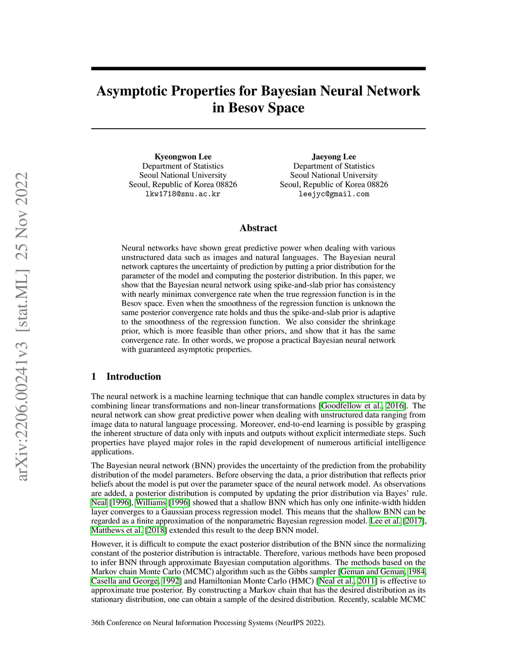 Neural networks have shown great predictive power when dealing with various unstructured data such as images and natural languages. The Bayesian neural network captures the uncertainty of prediction by putting a prior distribution for the parameter of the model and computing the posterior distribution. In this paper, we show that the Bayesian neural network using spike-and-slab prior has consistency with nearly minimax convergence rate when the true regression function is in the Besov space. Even when the smoothness of the regression function is unknown the same posterior convergence rate holds and thus the spike-and-slab prior is adaptive to the smoothness of the regression function. We also consider the shrinkage prior, which is more feasible than other priors, and show that it has the same convergence rate. In other words, we propose a practical Bayesian neural network with guaranteed asymptotic properties.