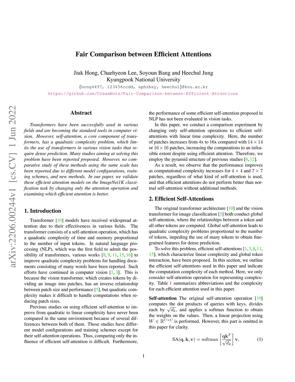 Transformers have been successfully used in various fields and are becoming the standard tools in computer vision. However, self-attention, a core component of transformers, has a quadratic complexity problem, which limits the use of transformers in various vision tasks that require dense prediction. Many studies aiming at solving this problem have been reported proposed. However, no comparative study of these methods using the same scale has been reported due to different model configurations, training schemes, and new methods. In our paper, we validate these efficient attention models on the ImageNet1K classification task by changing only the attention operation and examining which efficient attention is better.