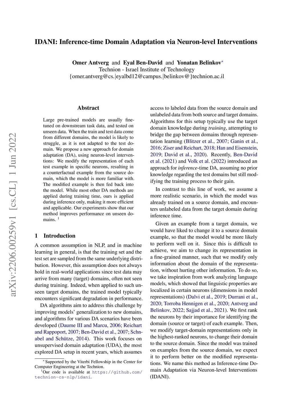 IDANI: Inference-time Domain Adaptation via Neuron-level Interventions