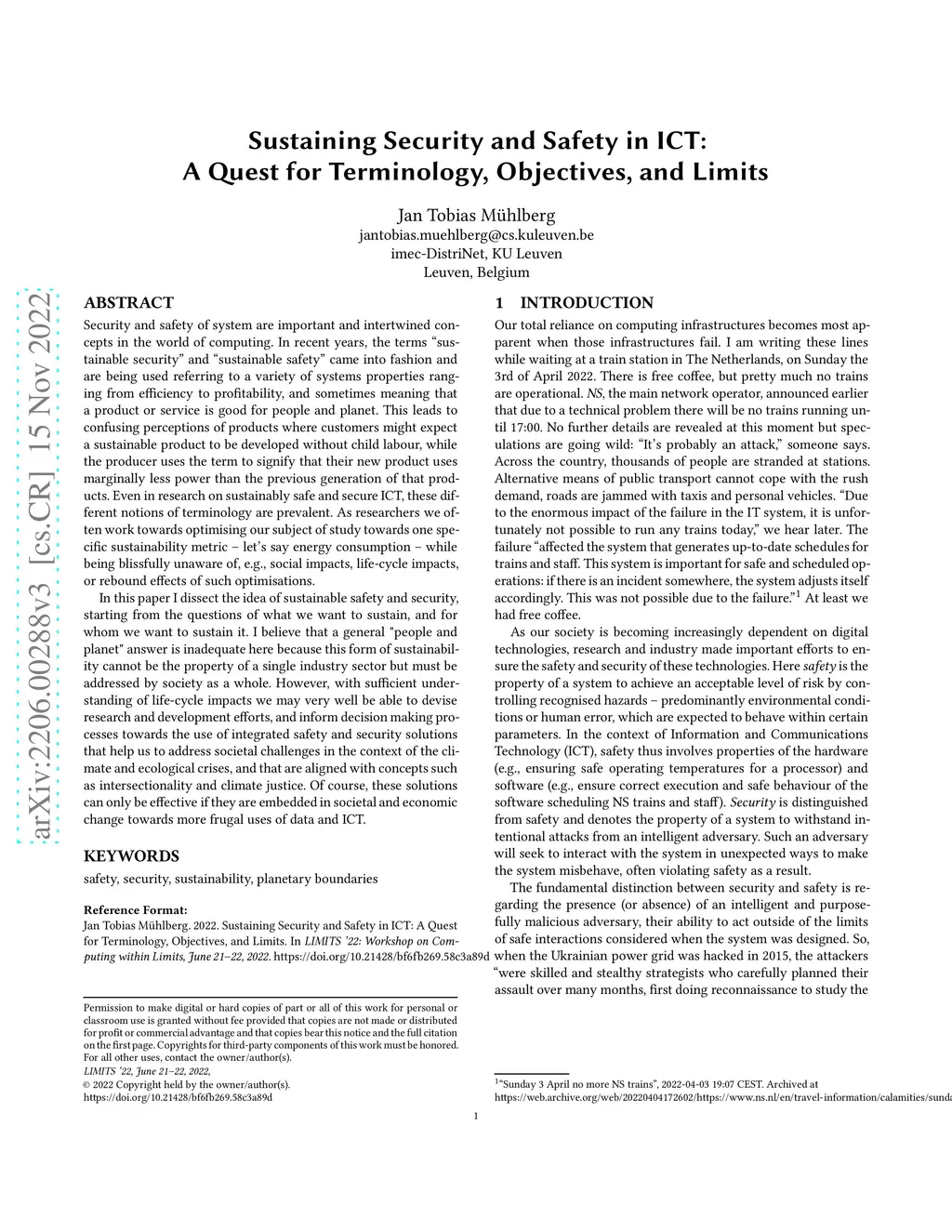 Security and safety are intertwined concepts in the world of computing. In recent years, the terms "sustainable security" and "sustainable safety" came into fashion and are being used referring to a variety of systems properties ranging from efficiency to profitability, and sometimes meaning that a product or service is good for people and planet. This leads to confusing perceptions of products where customers might expect a sustainable product to be developed without child labour, while the producer uses the term to signify that their new product uses marginally less power than the previous generation of that products. Even in research on sustainably safe and secure ICT, these different notions of terminology are prevalent. As researchers we often work towards optimising our subject of study towards one specific sustainability metric - let's say energy consumption - while being blissfully unaware of, e.g., social impacts, life-cycle impacts, or rebound effects of such optimisations. In this paper I dissect the idea of sustainable safety and security, starting from the questions of what we want to sustain, and for whom we want to sustain it. I believe that a general "people and planet" answer is inadequate here because this form of sustainability cannot be the property of a single industry sector but must be addressed by society as a whole. However, with sufficient understanding of life-cycle impacts we may very well be able to devise research and development efforts, and inform decision making processes towards the use of integrated safety and security solutions that help us to address societal challenges in the context of the climate and ecological crises, and that are aligned with concepts such as intersectionality and climate justice. Of course, these solutions can only be effective if they are embedded in societal and economic change towards more frugal uses of data and ICT.