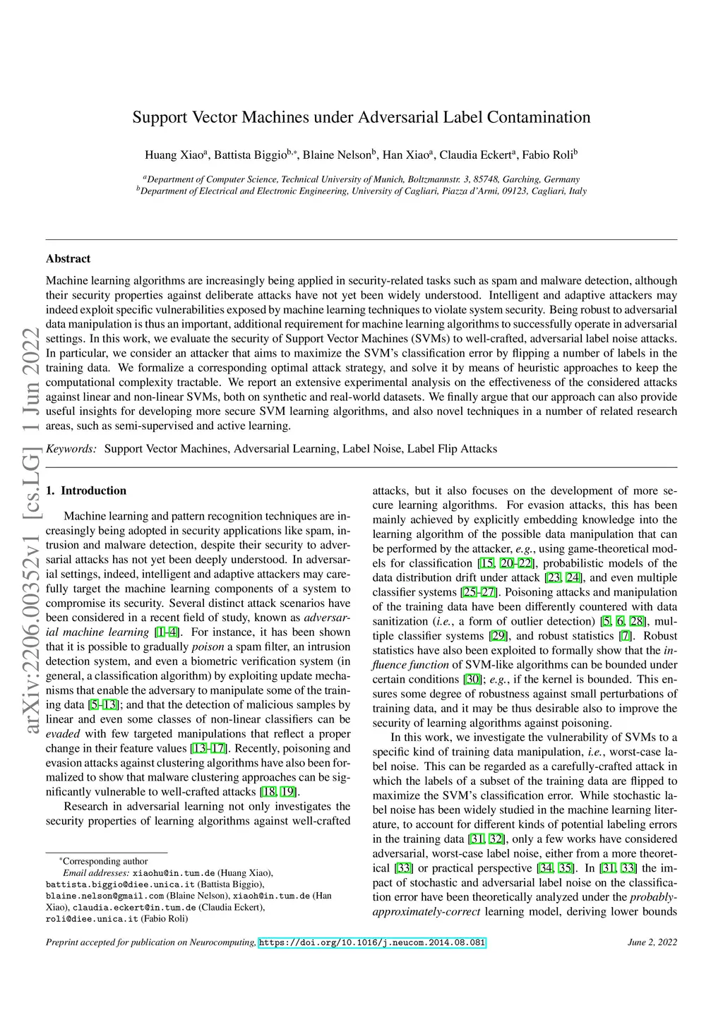 Machine learning algorithms are increasingly being applied in security-related tasks such as spam and malware detection, although their security properties against deliberate attacks have not yet been widely understood. Intelligent and adaptive attackers may indeed exploit specific vulnerabilities exposed by machine learning techniques to violate system security. Being robust to adversarial data manipulation is thus an important, additional requirement for machine learning algorithms to successfully operate in adversarial settings. In this work, we evaluate the security of Support Vector Machines (SVMs) to well-crafted, adversarial label noise attacks. In particular, we consider an attacker that aims to maximize the SVM's classification error by flipping a number of labels in the training data. We formalize a corresponding optimal attack strategy, and solve it by means of heuristic approaches to keep the computational complexity tractable. We report an extensive experimental analysis on the effectiveness of the considered attacks against linear and non-linear SVMs, both on synthetic and real-world datasets. We finally argue that our approach can also provide useful insights for developing more secure SVM learning algorithms, and also novel techniques in a number of related research areas, such as semi-supervised and active learning.