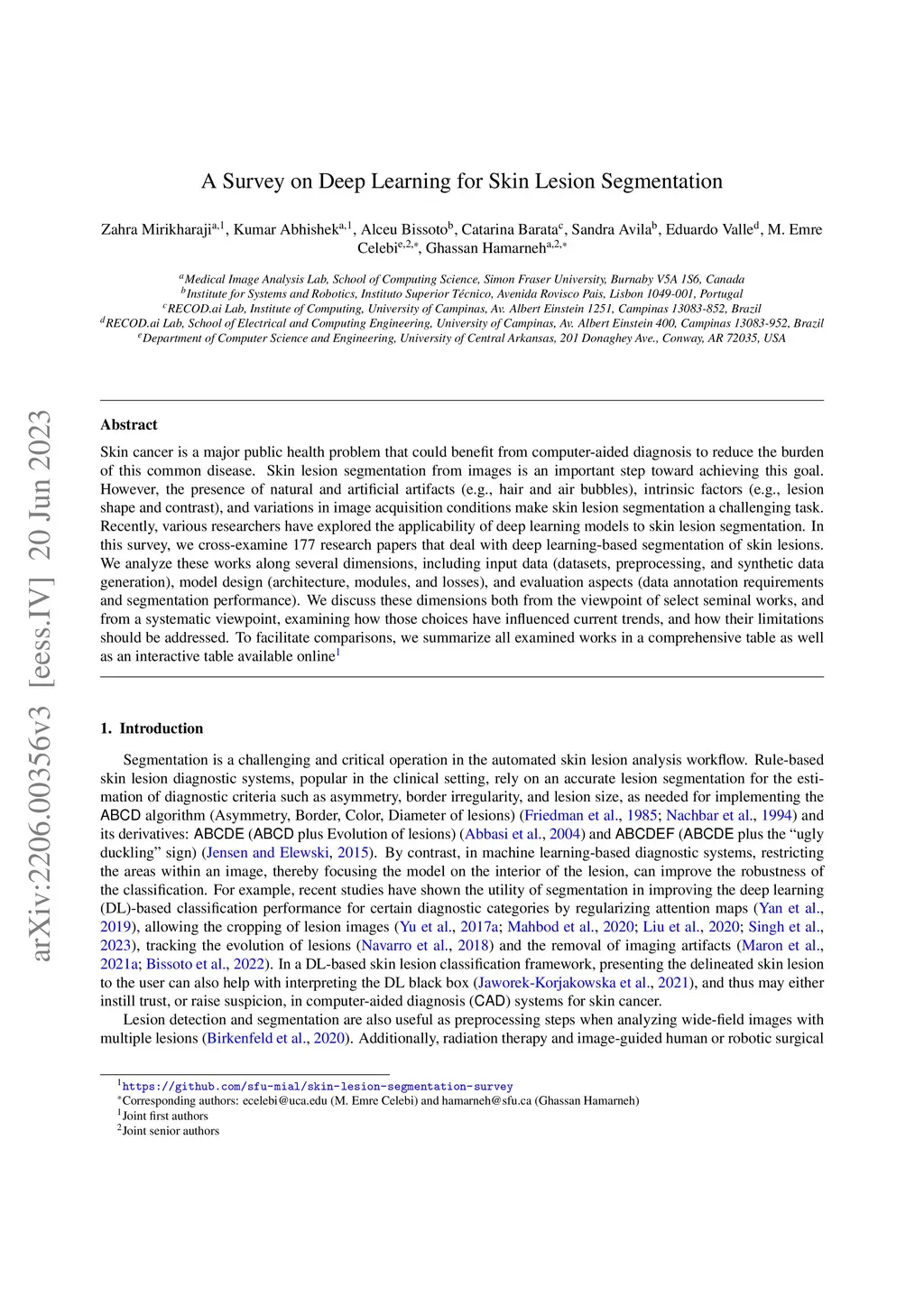 Skin cancer is a major public health problem that could benefit from computer-aided diagnosis to reduce the burden of this common disease. Skin lesion segmentation from images is an important step toward achieving this goal. However, the presence of natural and artificial artifacts (e.g., hair and air bubbles), intrinsic factors (e.g., lesion shape and contrast), and variations in image acquisition conditions make skin lesion segmentation a challenging task. Recently, various researchers have explored the applicability of deep learning models to skin lesion segmentation. In this survey, we cross-examine 177 research papers that deal with deep learning-based segmentation of skin lesions. We analyze these works along several dimensions, including input data (datasets, preprocessing, and synthetic data generation), model design (architecture, modules, and losses), and evaluation aspects (data annotation requirements and segmentation performance). We discuss these dimensions both from the viewpoint of select seminal works, and from a systematic viewpoint, examining how those choices have influenced current trends, and how their limitations should be addressed. To facilitate comparisons, we summarize all examined works in a comprehensive table as well as an interactive table available online at https://github.com/sfu-mial/skin-lesion-segmentation-survey.