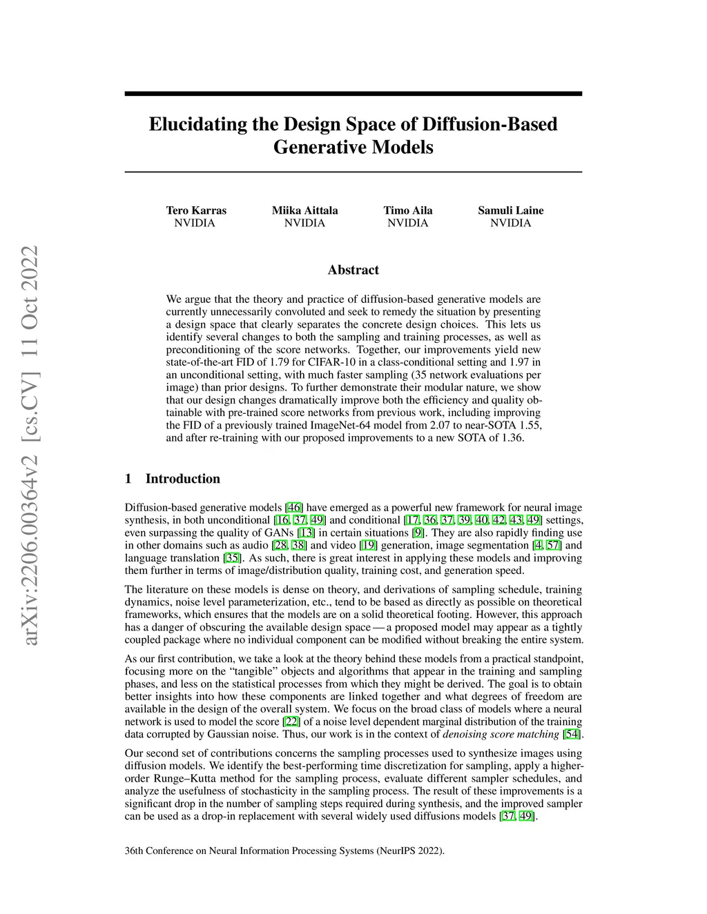 We argue that the theory and practice of diffusion-based generative models are currently unnecessarily convoluted and seek to remedy the situation by presenting a design space that clearly separates the concrete design choices. This lets us identify several changes to both the sampling and training processes, as well as preconditioning of the score networks. Together, our improvements yield new state-of-the-art FID of 1.79 for CIFAR-10 in a class-conditional setting and 1.97 in an unconditional setting, with much faster sampling (35 network evaluations per image) than prior designs. To further demonstrate their modular nature, we show that our design changes dramatically improve both the efficiency and quality obtainable with pre-trained score networks from previous work, including improving the FID of a previously trained ImageNet-64 model from 2.07 to near-SOTA 1.55, and after re-training with our proposed improvements to a new SOTA of 1.36.