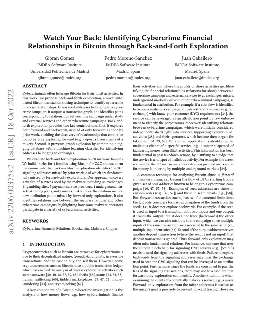Cybercriminals often leverage Bitcoin for their illicit activities. In this work, we propose back-and-forth exploration, a novel automated Bitcoin transaction tracing technique to identify cybercrime financial relationships. Given seed addresses belonging to a cybercrime campaign, it outputs a transaction graph, and identifies paths corresponding to relationships between the campaign under study and external services and other cybercrime campaigns. Back-and-forth exploration provides two key contributions. First, it explores both forward and backwards, instead of only forward as done by prior work, enabling the discovery of relationships that cannot be found by only exploring forward (e.g., deposits from clients of a mixer). Second, it prevents graph explosion by combining a tagging database with a machine learning classifier for identifying addresses belonging to exchanges. We evaluate back-and-forth exploration on 30 malware families. We build oracles for 4 families using Bitcoin for C&C and use them to demonstrate that back-and-forth exploration identifies 13 C&C signaling addresses missed by prior work, 8 of which are fundamentally missed by forward-only explorations. Our approach uncovers a wealth of services used by the malware including 44 exchanges, 11 gambling sites, 5 payment service providers, 4 underground markets, 4 mining pools, and 2 mixers. In 4 families, the relations include new attribution points missed by forward-only explorations. It also identifies relationships between the malware families and other cybercrime campaigns, highlighting how some malware operators participate in a variety of cybercriminal activities.