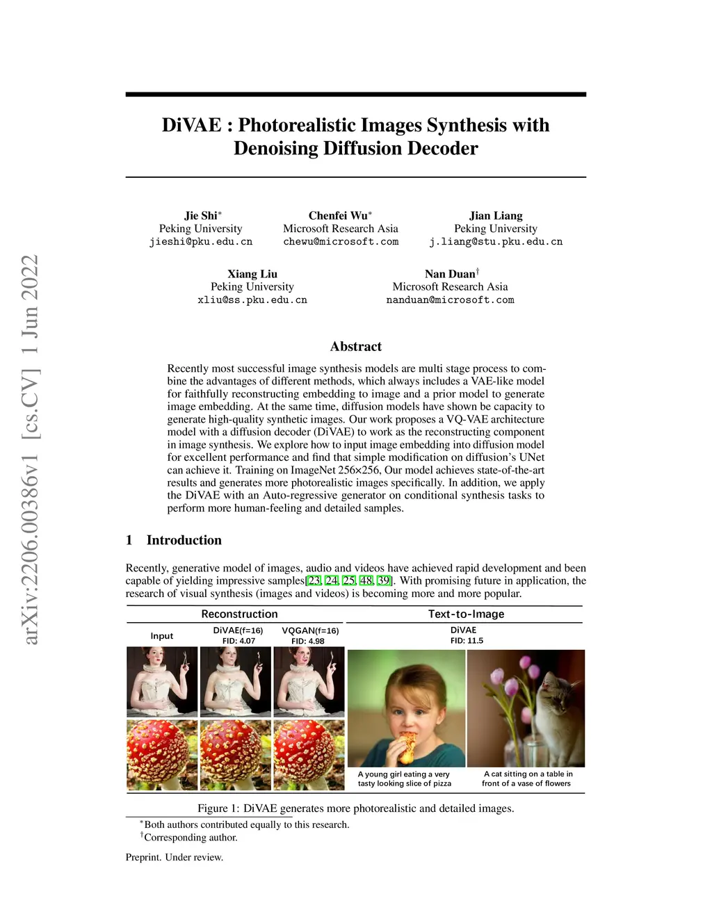 Recently most successful image synthesis models are multi stage process to combine the advantages of different methods, which always includes a VAE-like model for faithfully reconstructing embedding to image and a prior model to generate image embedding. At the same time, diffusion models have shown be capacity to generate high-quality synthetic images. Our work proposes a VQ-VAE architecture model with a diffusion decoder (DiVAE) to work as the reconstructing component in image synthesis. We explore how to input image embedding into diffusion model for excellent performance and find that simple modification on diffusion's UNet can achieve it. Training on ImageNet, Our model achieves state-of-the-art results and generates more photorealistic images specifically. In addition, we apply the DiVAE with an Auto-regressive generator on conditional synthesis tasks to perform more human-feeling and detailed samples.